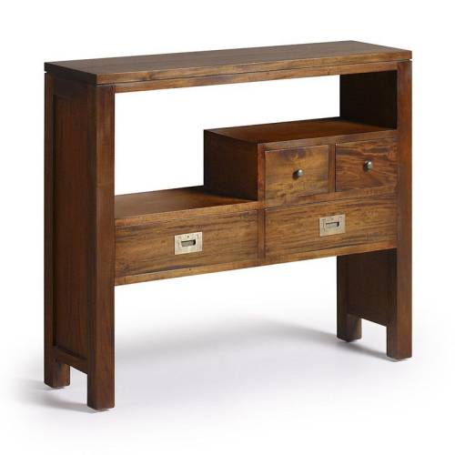 Donnez un style à la fois exotique et moderne à votre intérieur grâce à cette superbe petite console design ! Sa forme originale vous permettra de donner du caractère à votre pièce, qu'il s'agisse de votre salon, de votre entrée ou encore de votre couloir. Pratique, elle saura se glisser partout du fait de sa petite taille. Cette console vous offrira un bel espace pour exposer vos objets de décoration mais également pour ranger de petits objets dans ses tiroirs.