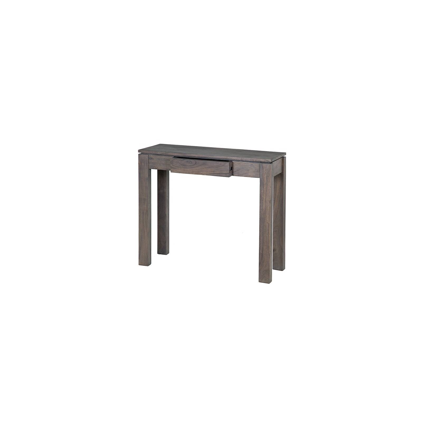 Superbe petite console à la teinte grisée ce qui lui donne un aspect contemporain très tendance, elle se mêlera tout particulièrement bien à un intérieur aux couleurs pastelles. Vous ne manquerez pas de tomber sous le charme de son bois, de l'acacia massif, qui est une essence exotique au veinage agréable. Sa finition est légèrement brillante ce qui permet de refléter doucement les rayons du soleil. Son style ethnique moderne apportera beaucoup d'attrait à votre pièce, cette console sera tout à fait adaptée à une entrée pour vous servir à ranger vos clefs et papiers dans son petit tiroir central.