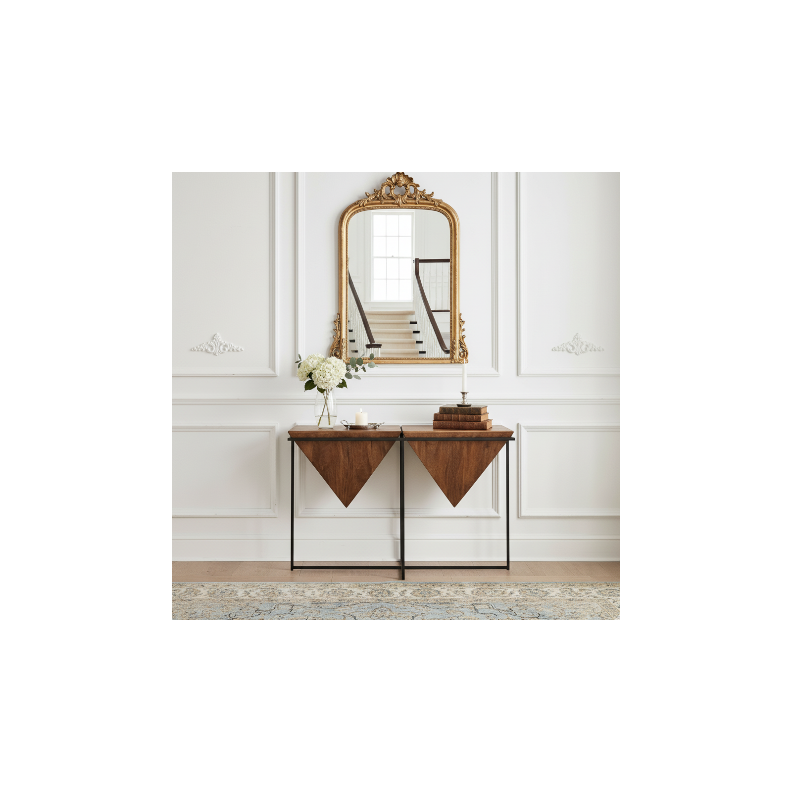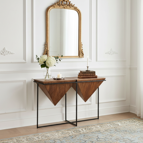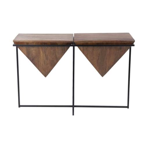 Découvrez l'élégance contemporaine de la console pyramide avec son plateau en forme de double pyramide inversée en manguier et son piétement en métal.