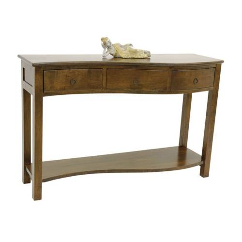 Cette belle console en hévéa massif possède une structure originale avec sa délicate forme de vague. Son style colonial conviendra tout particulièrement à une entrée ou à un salon à l'atmosphère soignée et au mobilier traditionnel. Pouvant être utilisée comme meuble d'appoint pour y déposer vos clefs et papiers dans ses tiroirs, elle sera également un meuble décoratif, support idéal de vos cadres et vases grâce à ses deux plateaux. Cette charmante console bois massif est présentée en teinte Chêne Foncé Verni.