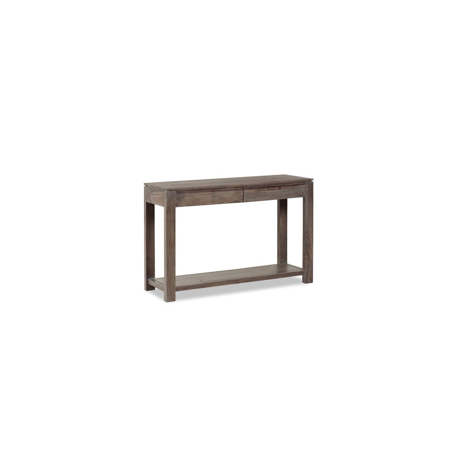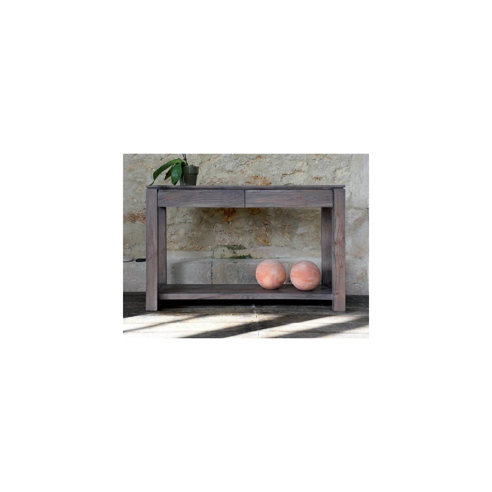 Voici une grande console en bois exotique, appartenant à une gamme de meubles contemporains, la collection Acacia Tara Grisée.