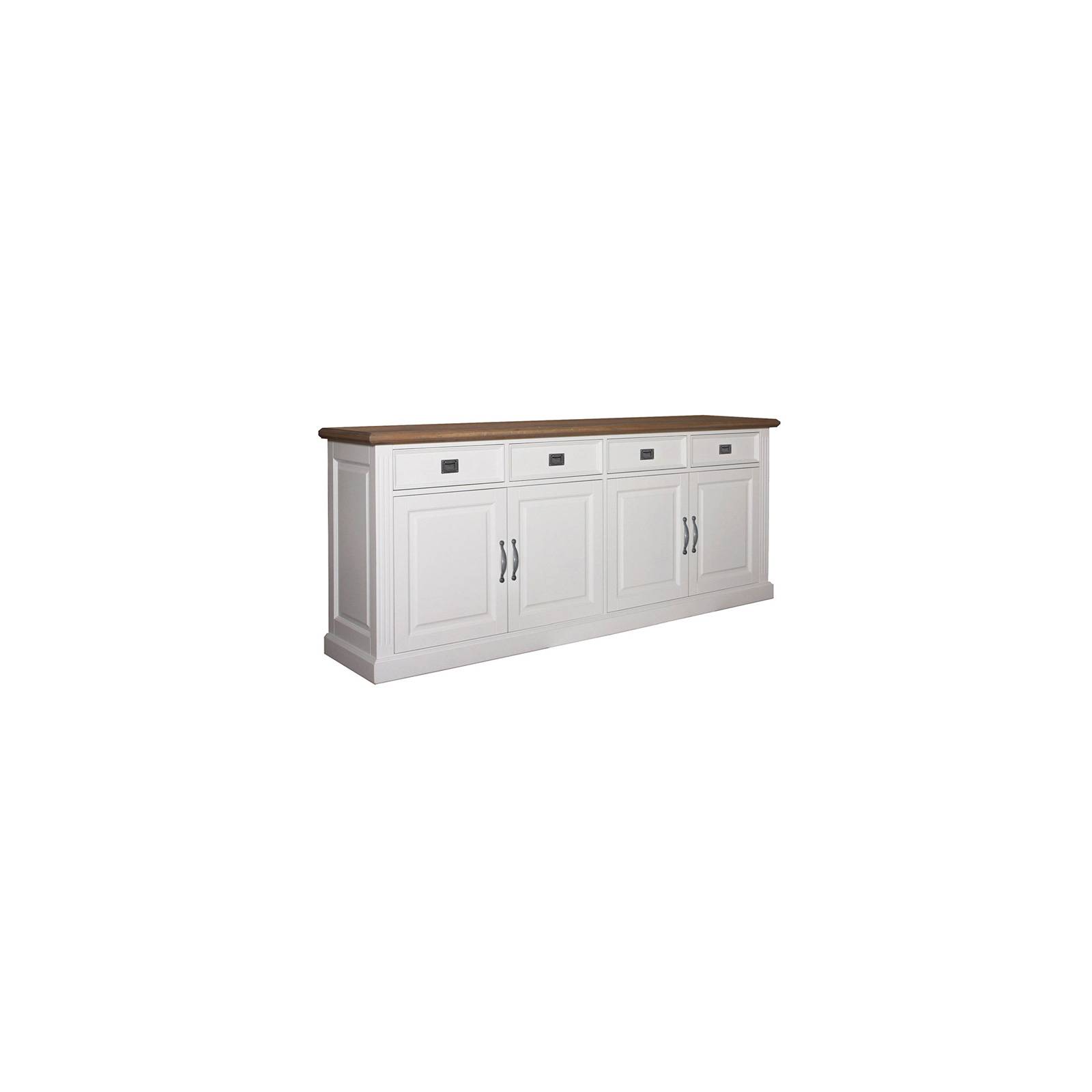 Laissez-vous séduire par la prestance de ce buffet bicolore qui arbore fiérement ses lignes à la fois sobres et raffinées. Une inspiration puisée dans le style classique qui lui confère une élégance indémodable. Imprégnée par l'art de vivre des maisons de famille d'autrefois, cette enfilade se glissera avec beaucoup de naturel dans votre salle à manger pour accueillir votre linge de table, votre vaisselle et vos couverts qui trouveront la place nécessaire derrière ses quatre portes et ses quatre tiroirs. Faites de son large plateau un terrain d'expression pour vos inspirations déco en cohérence avec un environnement authentique et romantique.