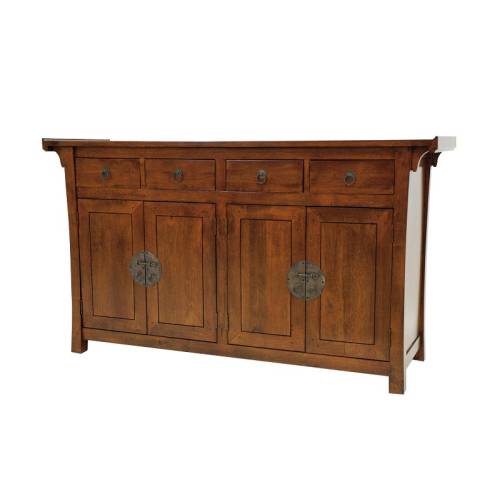 Magnifique enfilade en hévéa massif, un très beau bois exotique issu d'une culture éco-certifiée en Thaïlande. Le veinage très discret de ce bois et sa teinte clair lui permettent d'être aisément teinté, la photo ci-contre le présente en finition Chêne Foncé Verni. Vous apprécierez sa silhouette légèrement galbée et le détail de ses fermoirs en métal, le tout dans un esprit oriental et plus précisément chinois. Ainsi vous obtiendrez une ambiance ethnique très soignée grâce à la présence de ce buffet dans votre salle de repas. De plus, ses dimensions honorables vous permettront de ranger toute votre vaisselle derrière ses quatre portes et dans ses quatre tiroirs.