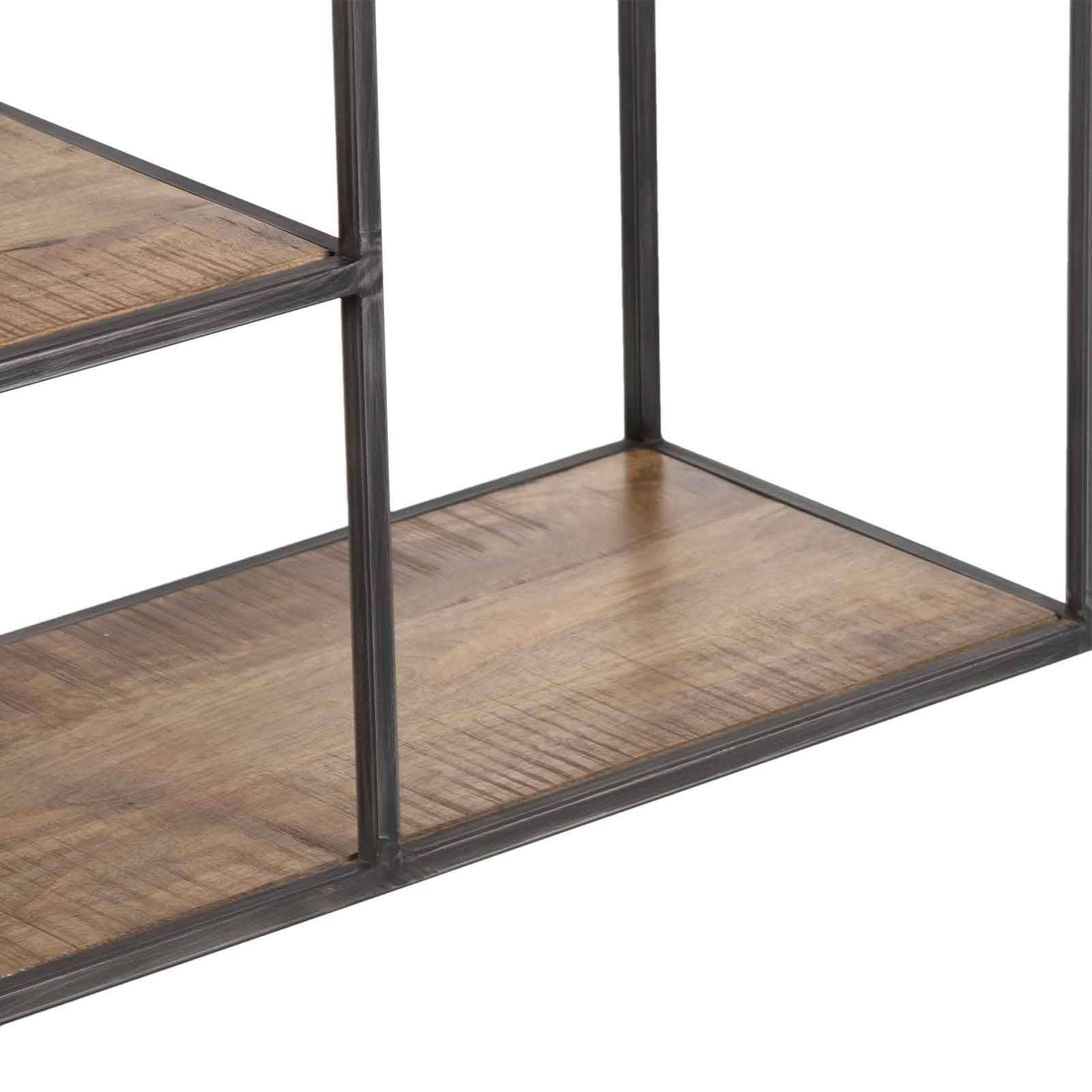 La structure en métal de 16 mm, polie à la main avec une finition noire antique, confère à l'étagère une allure industrielle chic. La disposition déstructurée des étagères ajoute une dimension contemporaine et artistique à la pièce, créant un espace de stockage qui est aussi une œuvre d'art. Les trois plateaux en manguier massif de 16 mm d'épaisseur offrent non seulement une surface solide pour exposer vos objets préférés, mais également une niche ouverte, ajoutant une dimension visuelle intrigante.