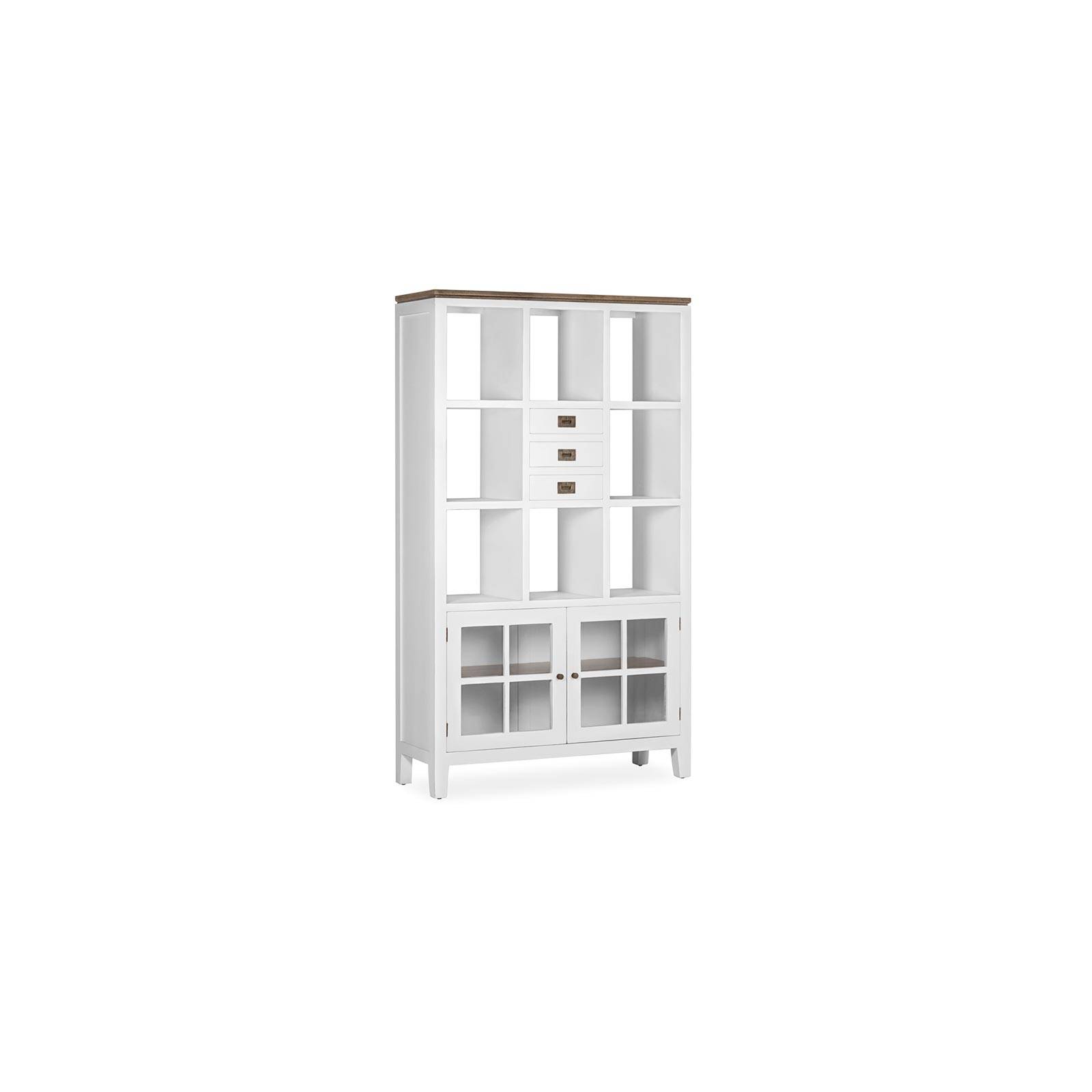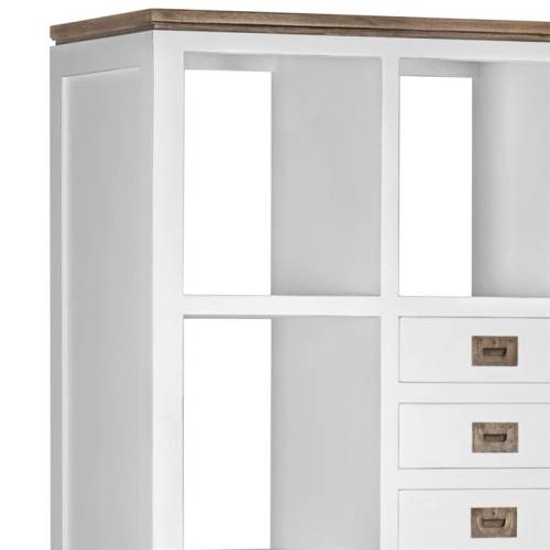 Cette belle étagère bois blanc à cases comporte également trois tiroirs et deux portes vitrées. De quoi changer des modèles basiques que l'on trouve dans les grandes chaînes de magasins de meubles !