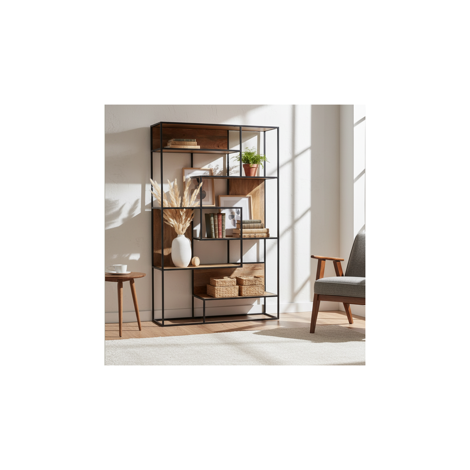 L'etagere bois et métal avec ses 9 niches, offre une solution de rangement généreuse et stylée, idéale pour exposer vos livres ou objets décoratifs.