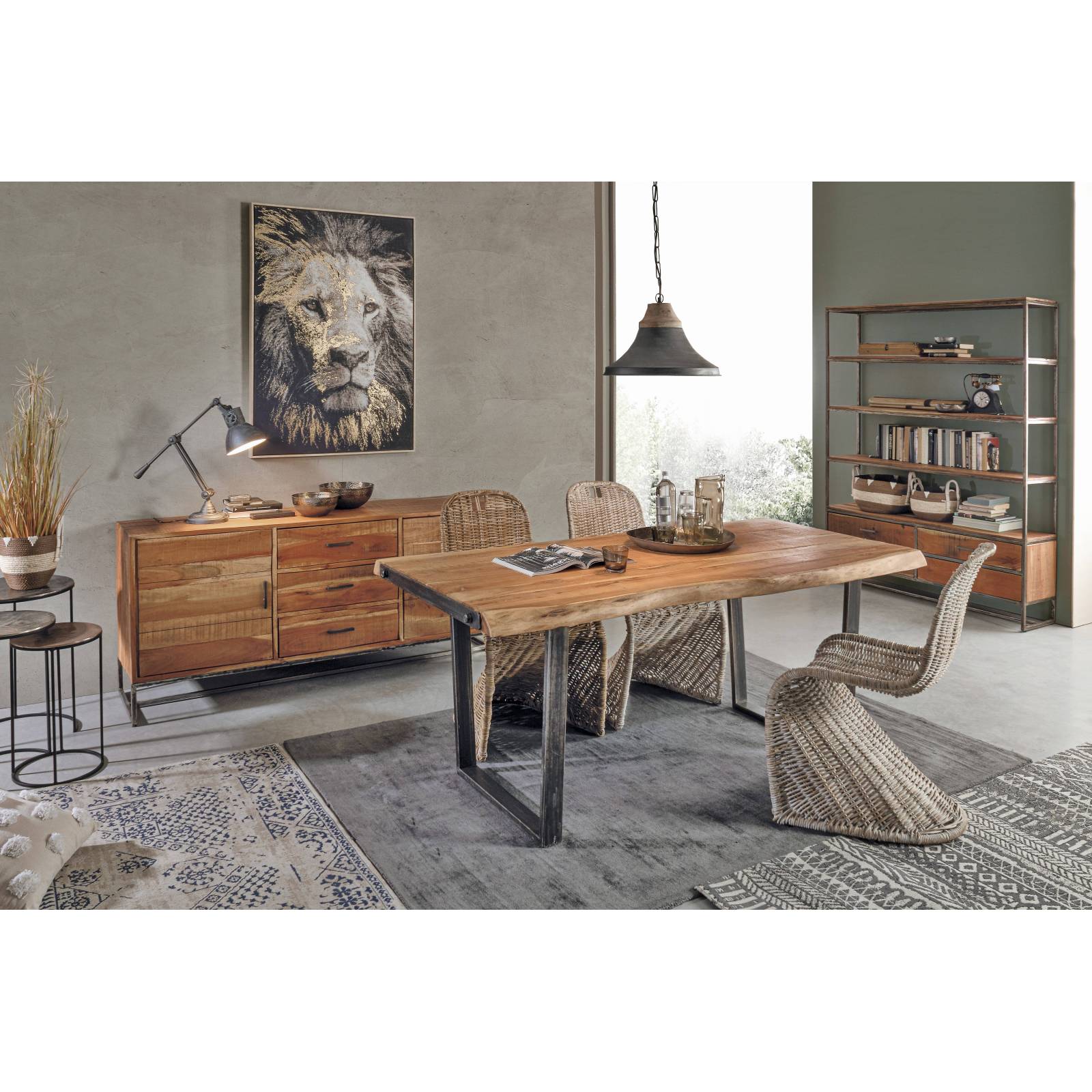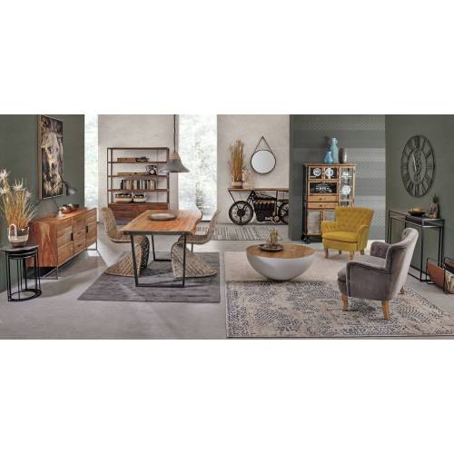 Structure en acier, étagères et tiroirs en bois d'acacia, dos en contreplaqué. Finition acrylique de protection.