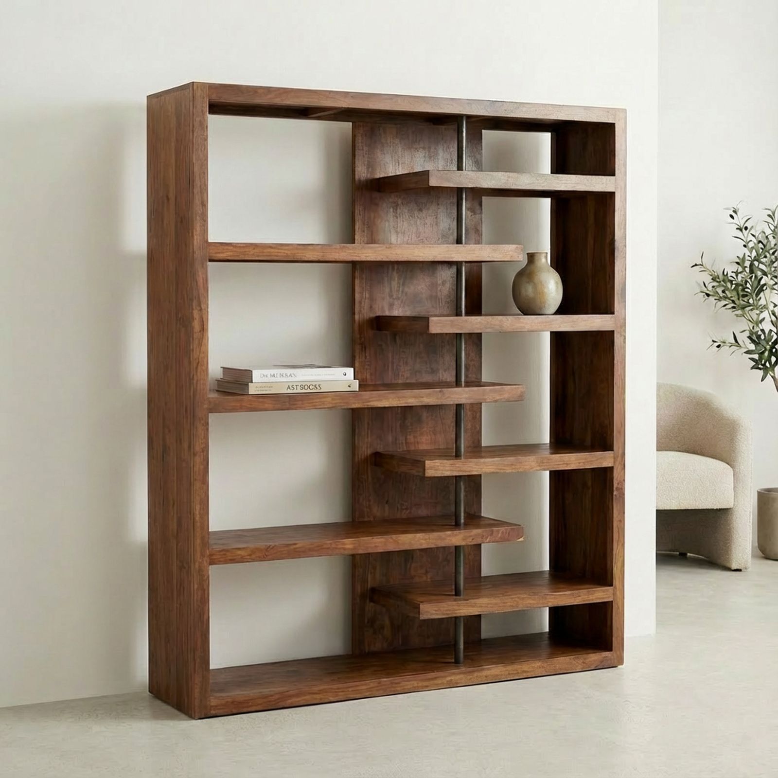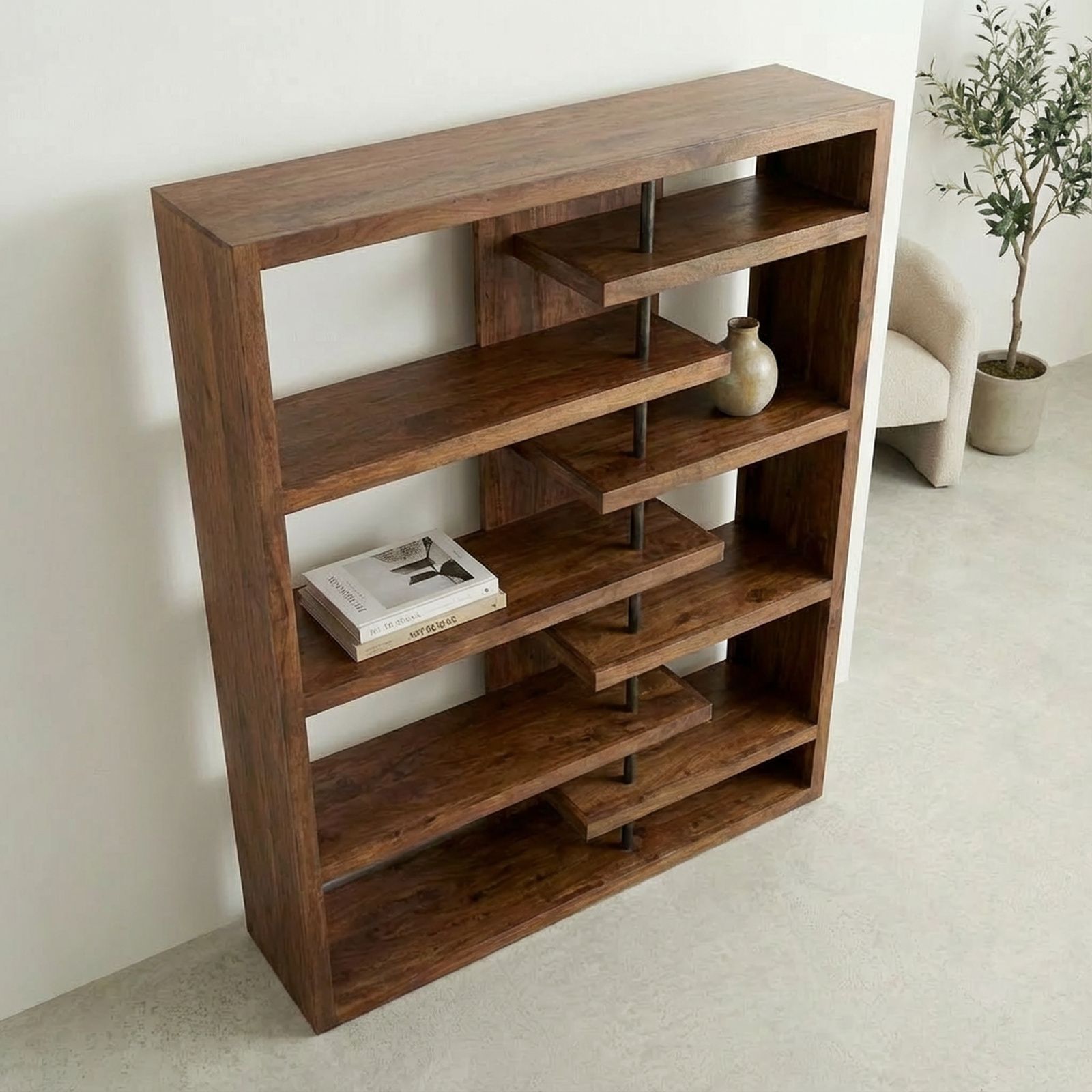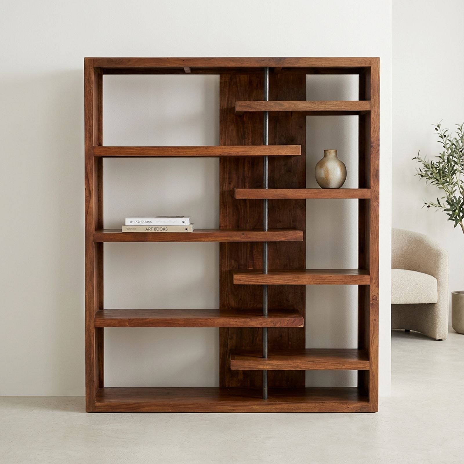 Grâce ceci et à sa finition cirée, cette belle étagère destructurée possède un caractère ethnique, qui réveillera joliment votre pièce. Ses formes épurées se caractérisent par un jeu de rythme entre deux groupes d'étagères de tailles différentes, pour un rendu moderne plein de charme. Vous pourrez ranger de nombreux livres dans ce meuble original, qui pourra également accueillir vos objets de décoration.
