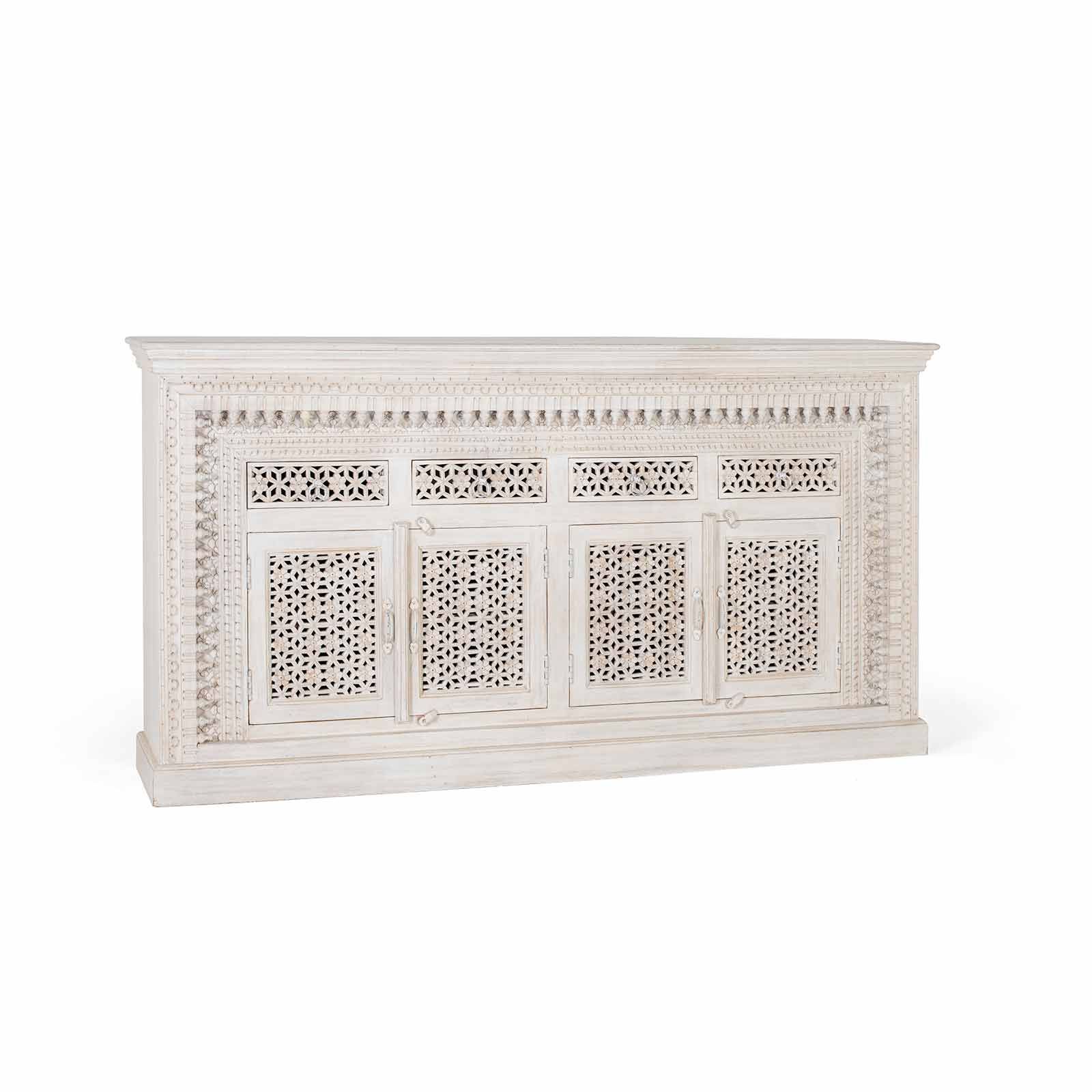Fabriqué à partir de manguier massif, un bois connu pour sa durabilité et sa beauté naturelle, ce buffet amène dans votre maison un artisanat exceptionnel et un style intemporel. Sa finition blanc vieilli lui confère une allure à la fois classique et moderne, apportant une luminosité et une douceur à votre espace de vie. Chaque détail de ce buffet, des quatre portes aux quatre tiroirs, est minutieusement sculpté à la main avec des motifs arabesques sophistiqués, ajoutant une touche artistique et exquise à son esthétique.
