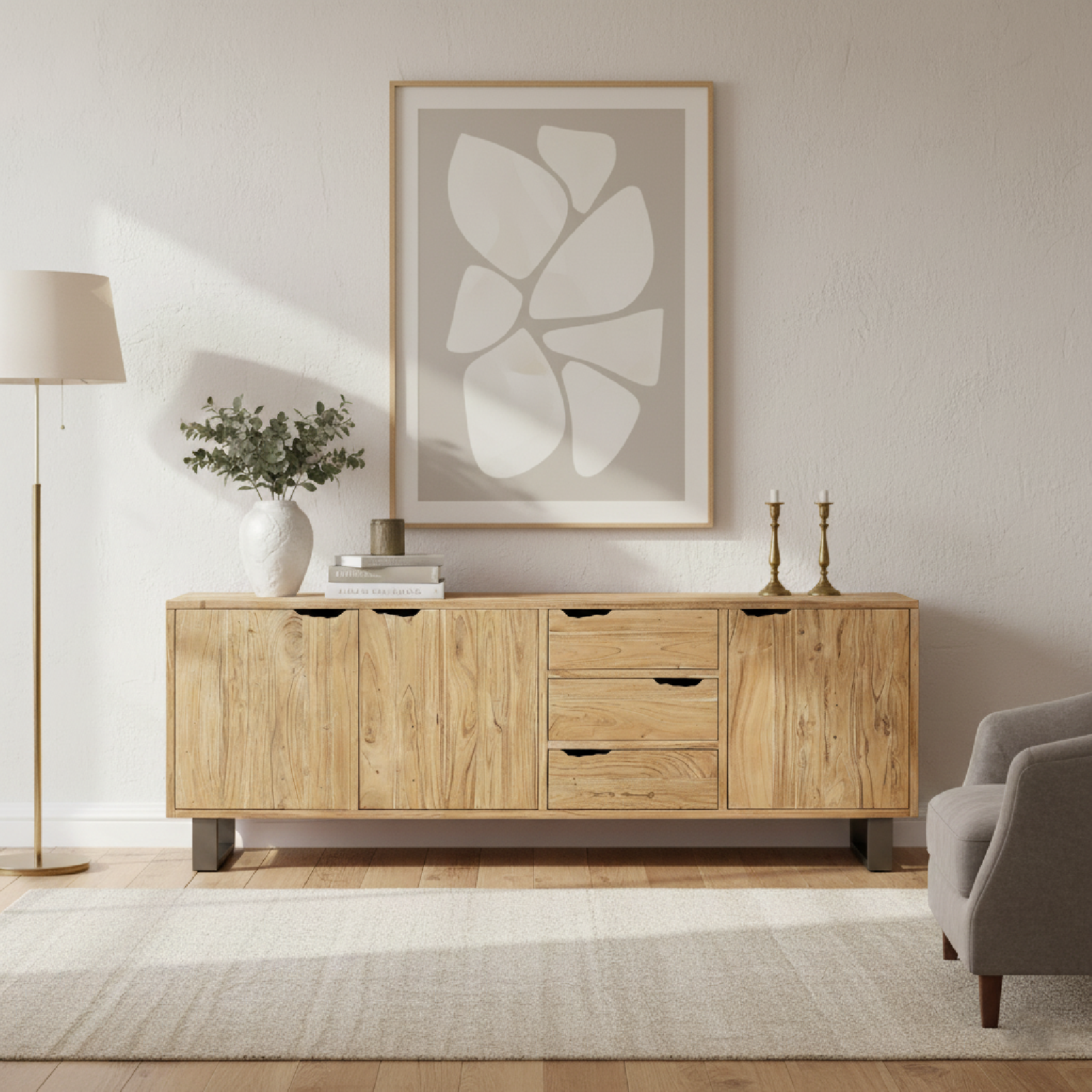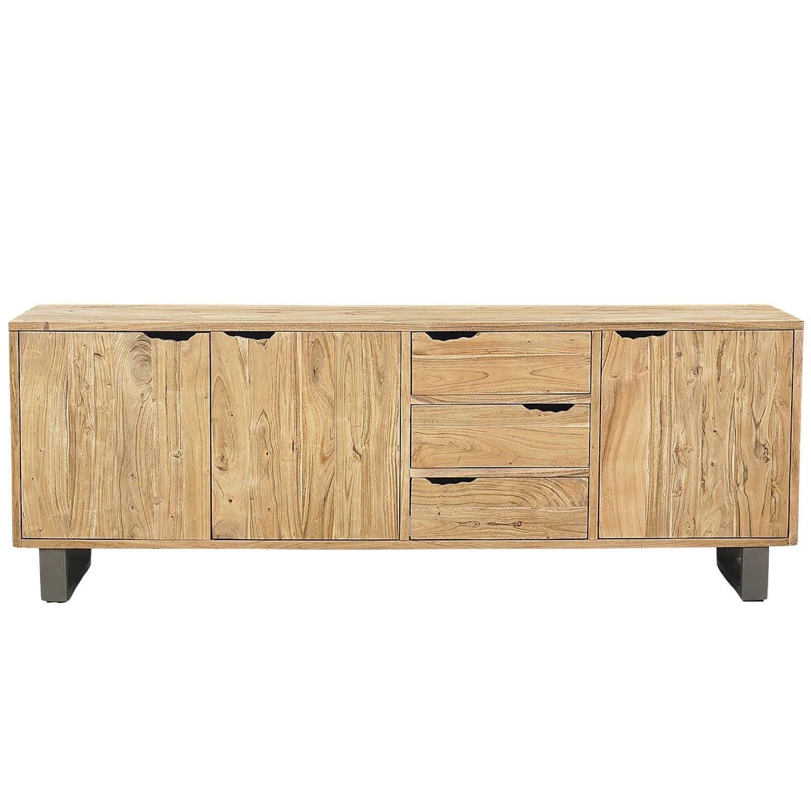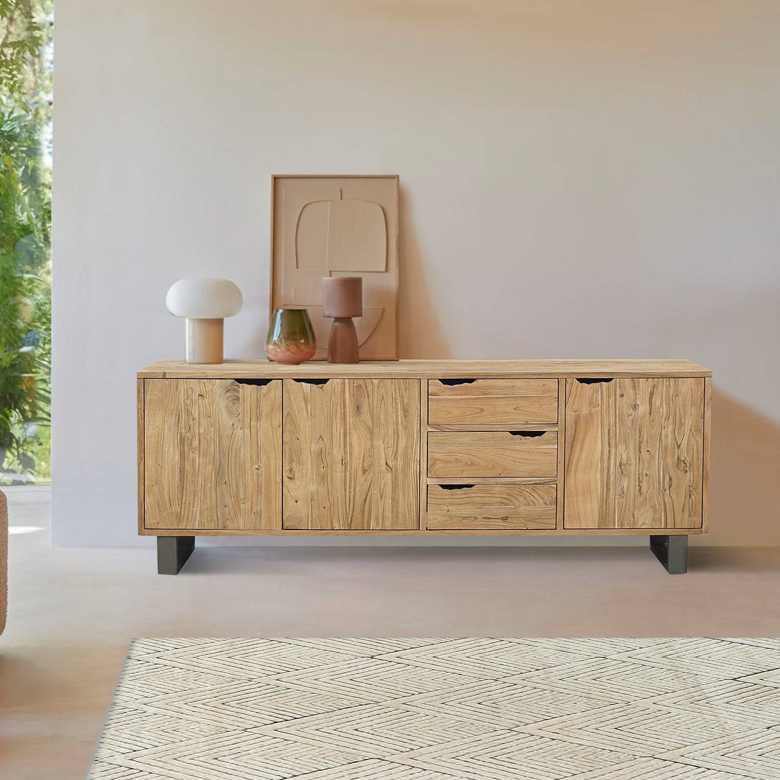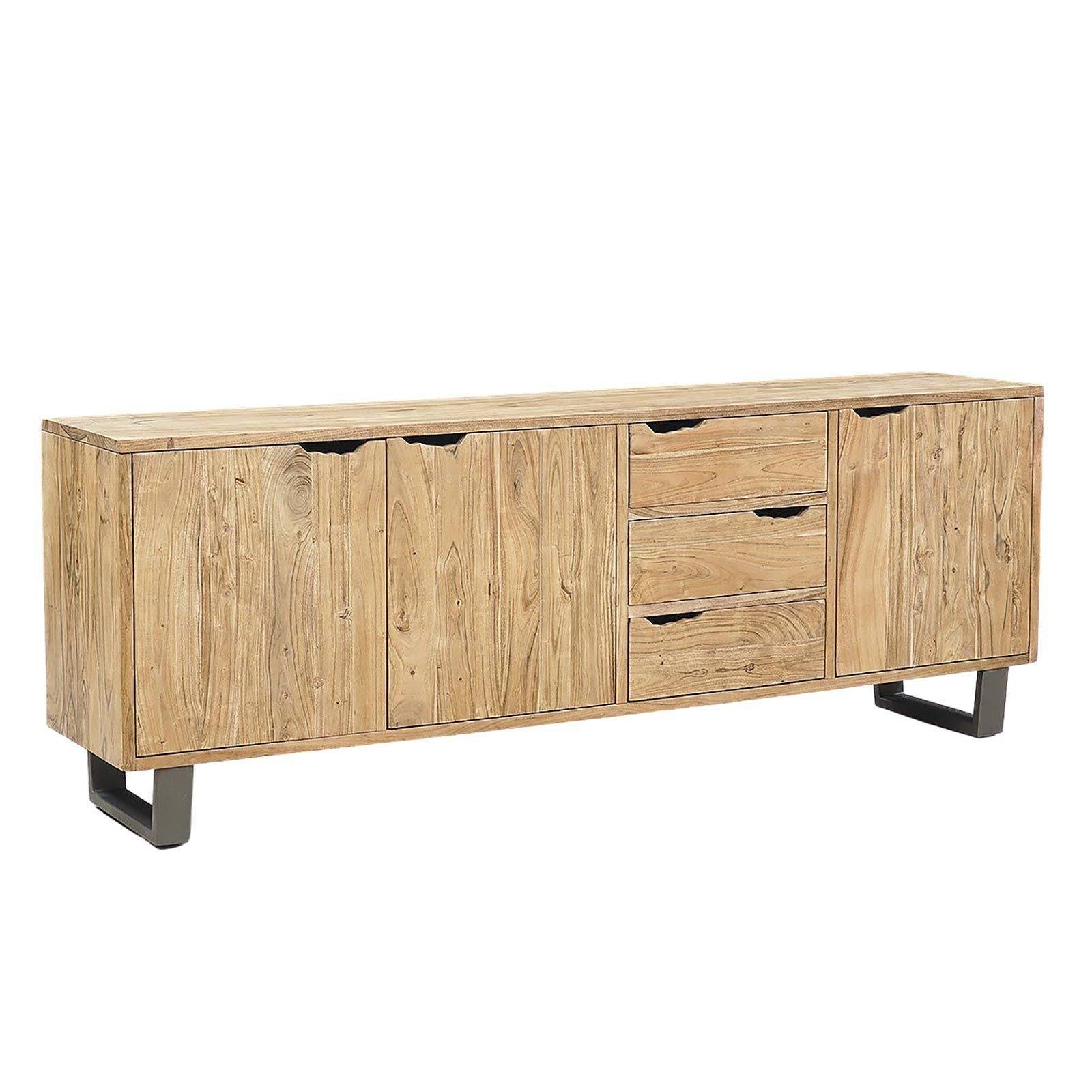 On ne reste pas indifférent à ce grand buffet en bois massif, qui trônera en majesté dans votre séjour. La beauté du bois d'acacia, saisissante, s'exprime dans un assemblage qui conserve et respecte la noblesse de l'arbre. Une transformation minime, en effet, confiée à des artisans indiens soucieux de la qualité. Manufacturée pour durer, cette enfilade vous accompagnera de longues années et passera les modes grâce à son style bien affirmé qui associe à l'esprit nature une touche contemporaine subtile, visible dans ses pieds en métal.