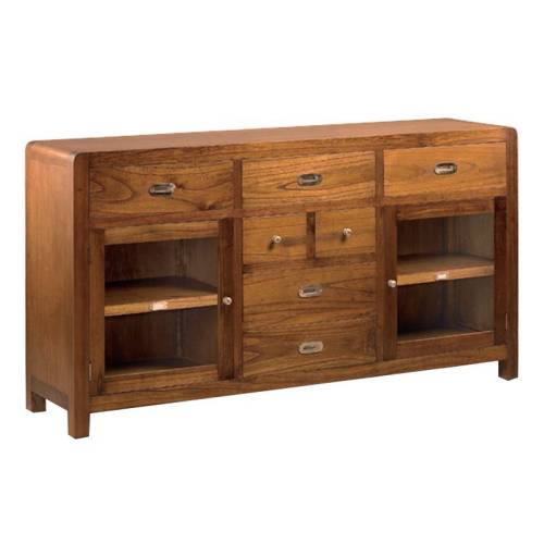 Composé de sept tiroirs dont deux sont réversibles et doté de deux portes vitrées, ce buffet en mindi ne manque pas d'espaces de rangement pour y installer votre vaisselle. Avec ses angles arrondis, ce buffet se rapproche du mobilier rétro et plus précisément des meubles des années 60. Ainsi, en plus de vous offrir un espace de rangement pratique, il participera à créer une ambiance tendance dans votre salle à manger et pourra être accompagné de déco vintage.