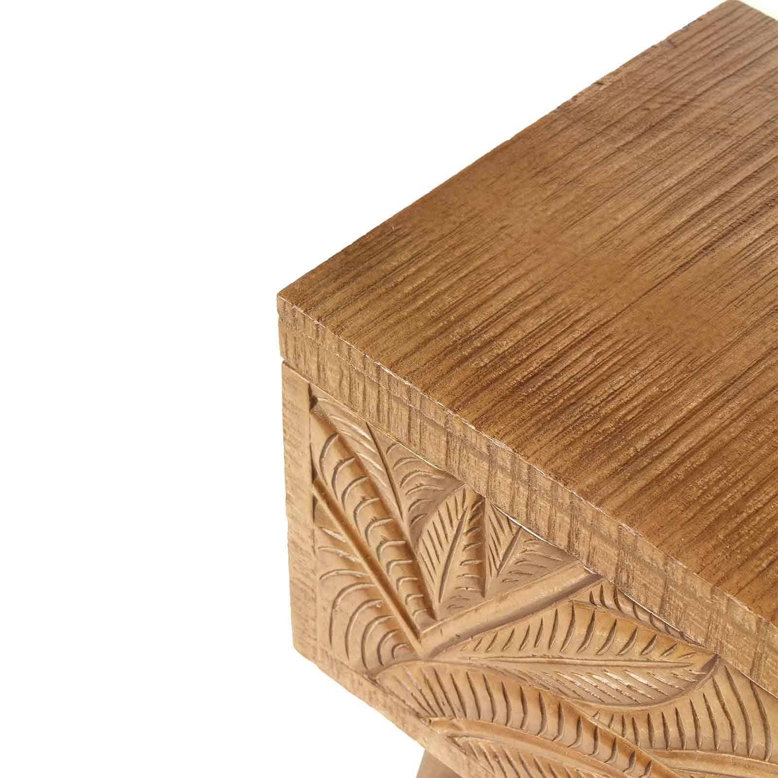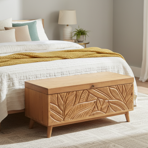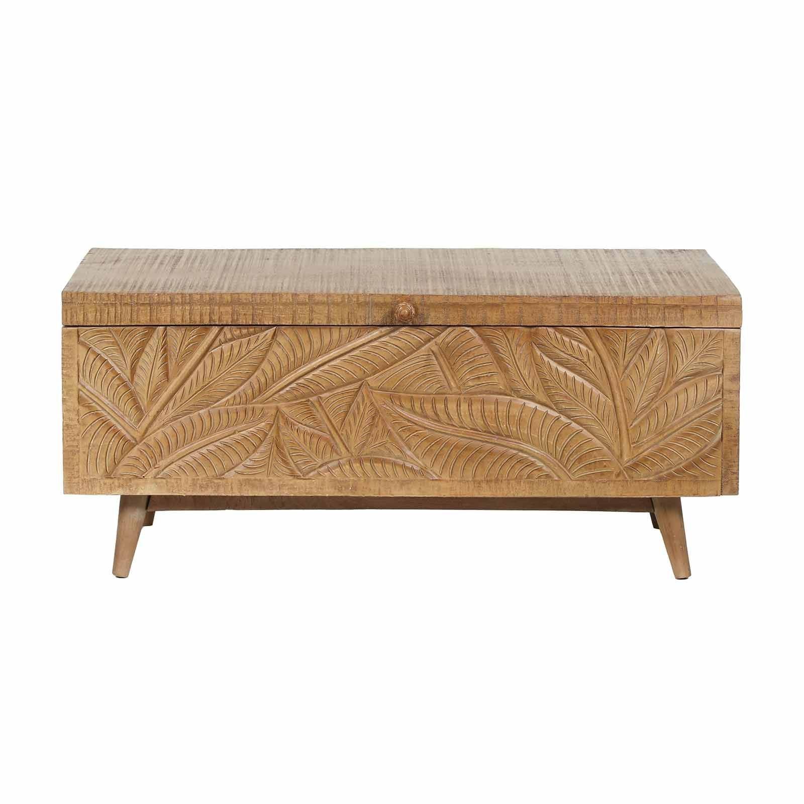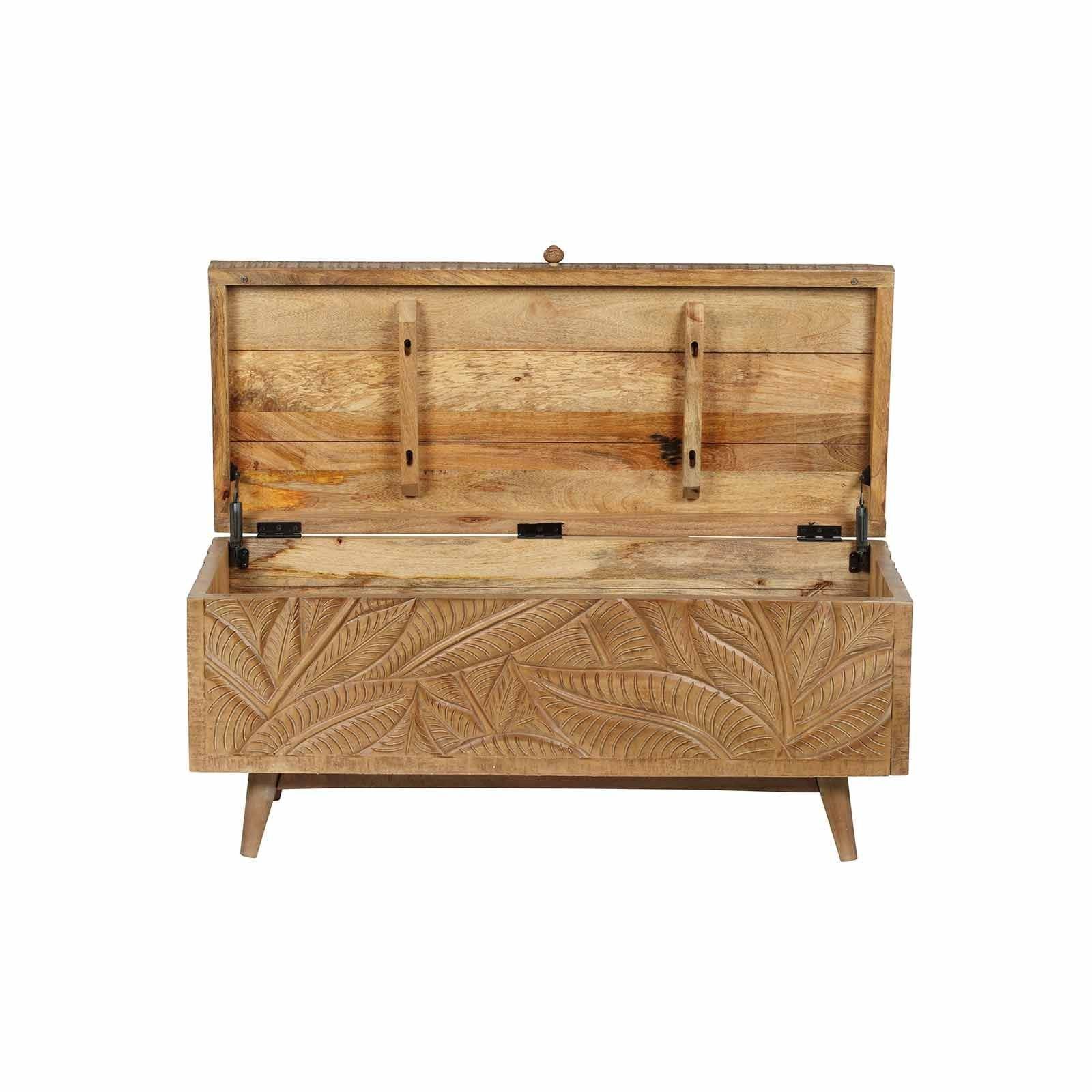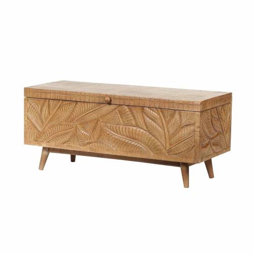 Le grand coffre sculpté amène l'élégance exotique dans votre maison. Fabriqué entièrement en manguier massif, il offre un espace de rangement généreux.