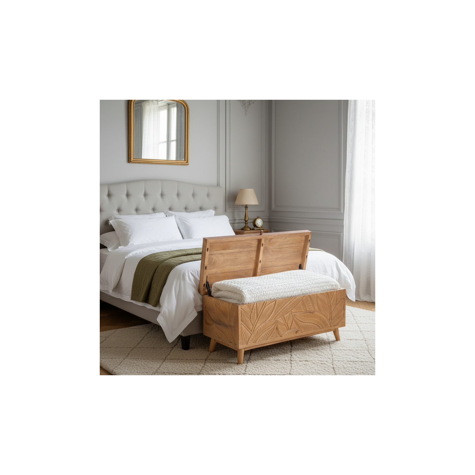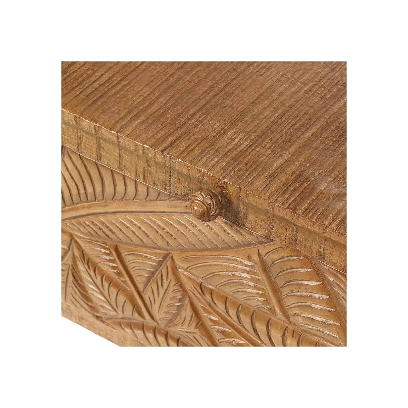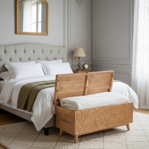 Avec son artisanat exceptionnel et ses matériaux de qualité, le grand coffre sculpté de la collection Manguier Botania devient non seulement un élément pratique pour ranger vos affaires, mais aussi un meuble élégant qui ajoute du caractère à votre maison. Que ce soit dans le salon, la chambre à coucher ou tout autre espace, ce coffre sera un ajout remarquable qui attire le regard et donne des envies d'évasion.