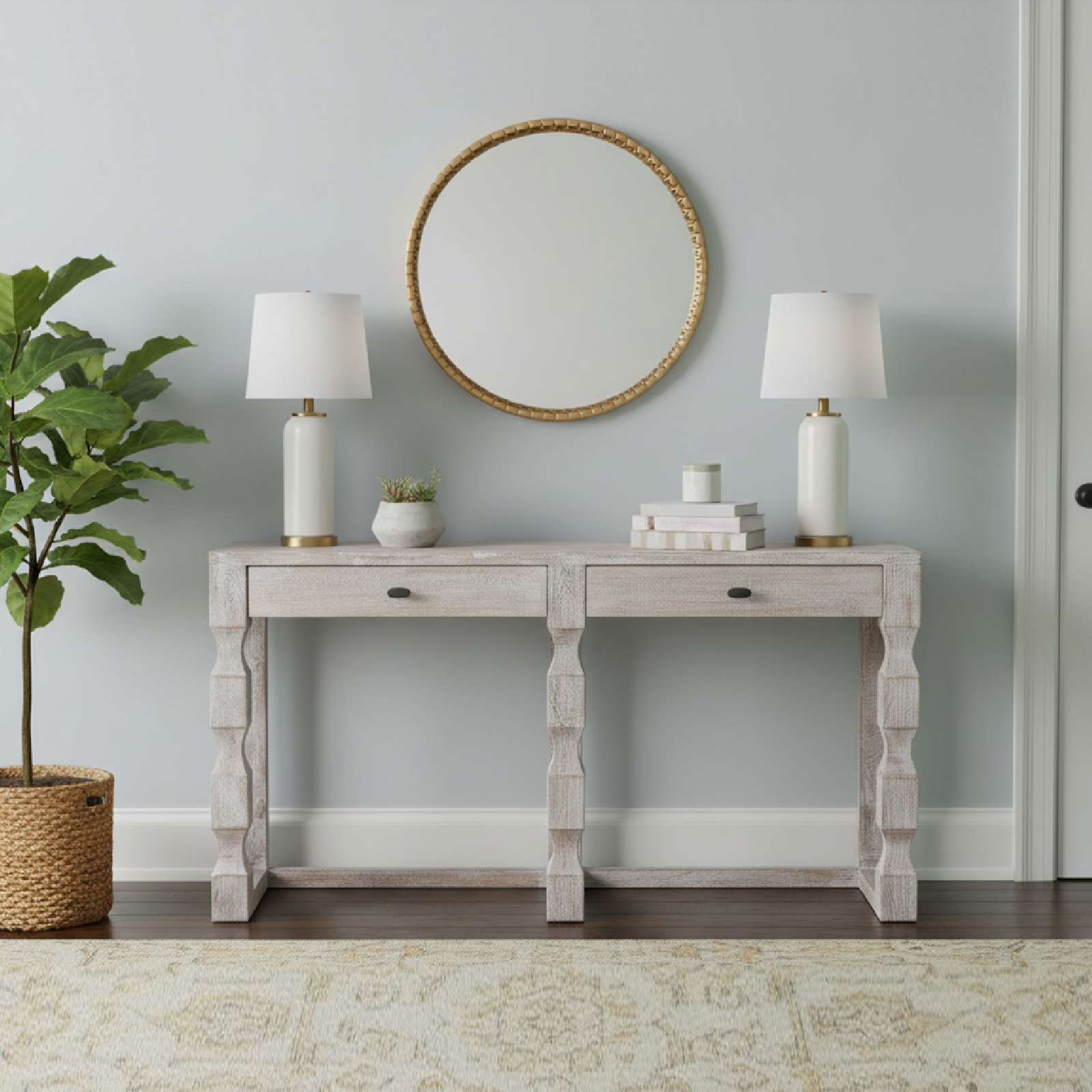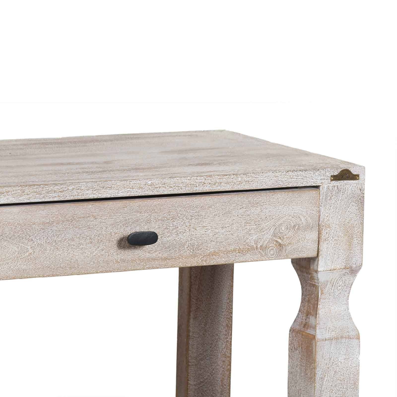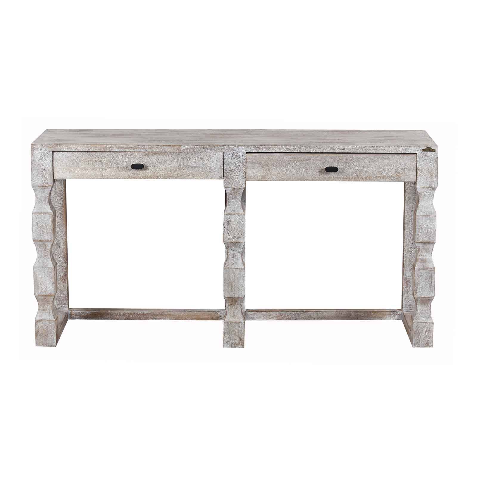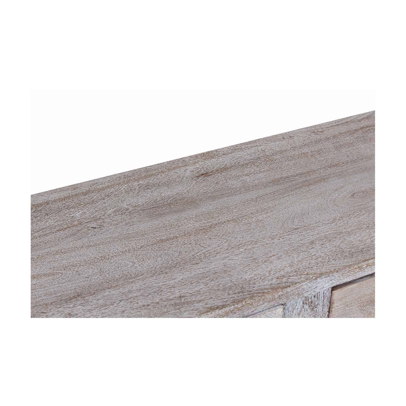 La grande console bois Hampton est fabriquée en manguier massif avec une finition blanc vieilli qui lui confère une patine délicate.