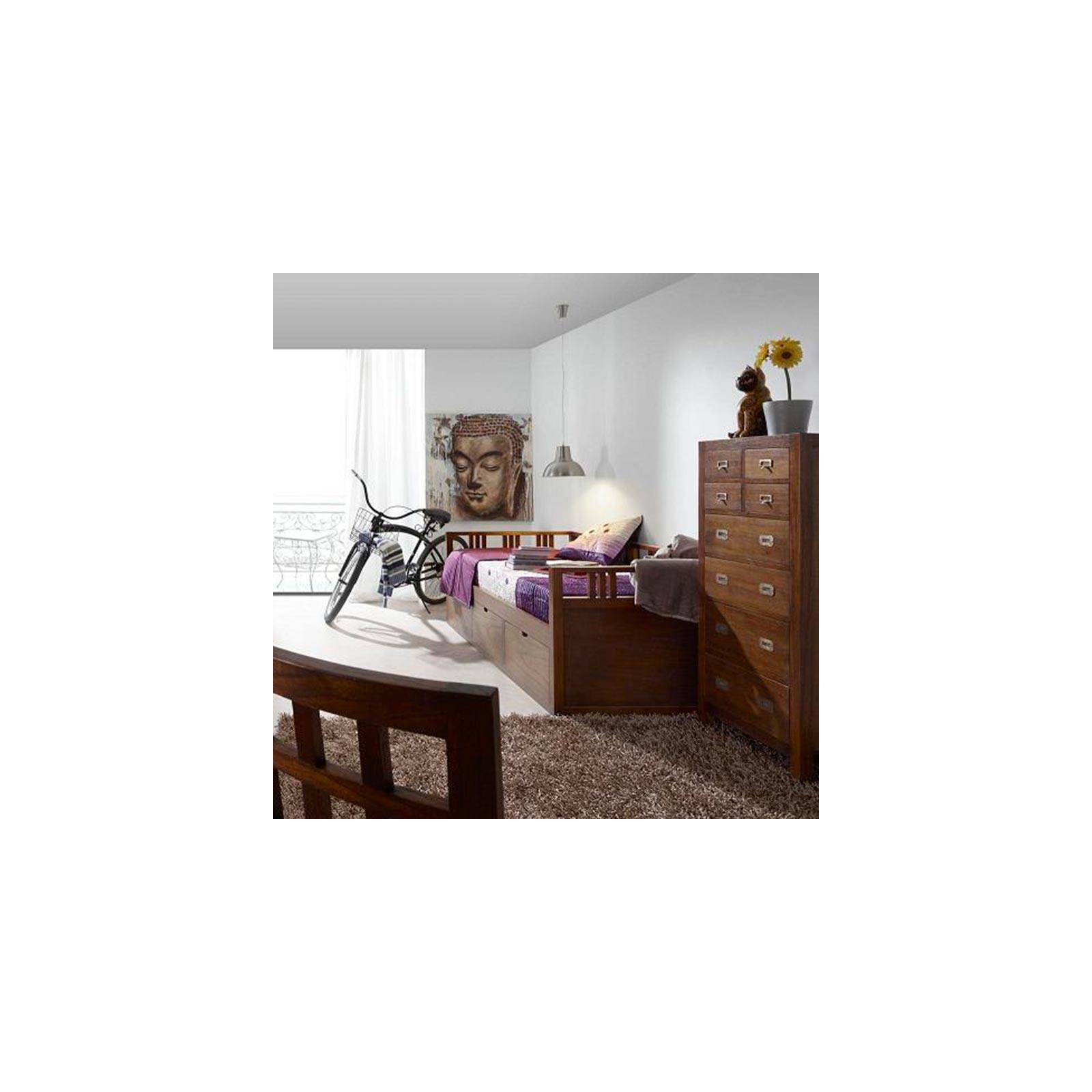 Très pratique, ce Lit gigogne enfant d'une personne pourra accueillir un invité supplémentaire en cas de besoin puisqu'un second lit se cache dans son compartiment à la façon d'un tiroir. Mais cela n'est pas le seul atout de ce beau Lit gigogne enfant puisqu'il est doté d'un grand cadre aux motifs ajourés qui lui donnent un caractère origianl, inspiré des meubles coloniaux. Il est d'ailleurs composé de bois exotique, du mindy, une essence cultivée de façon écologique et éthique en Indonésie.