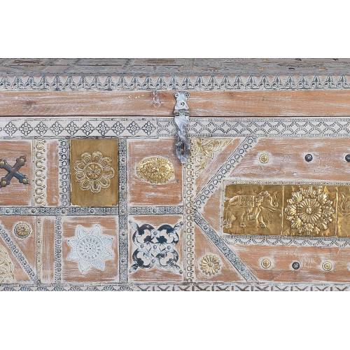 Cette belle malle est en manguier massif sculpté de motifs ethniques avec des détails en bronze faits main. Un meuble déco original pour votre intérieur.