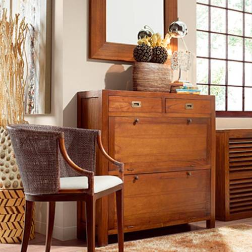 Ce ravissant meuble à chaussures en bois exotique comporte plusieurs espaces de rangement. Son style moderne rappelle le style du mobilier colonial revu au goût du jour.
