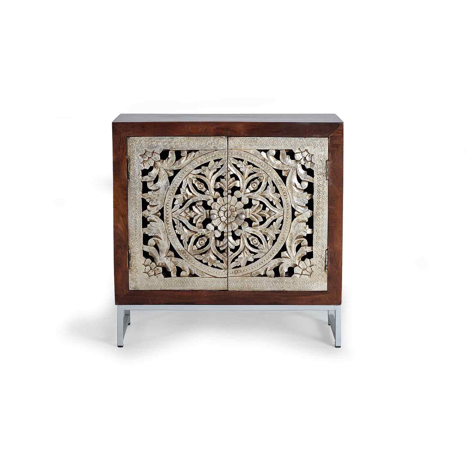 Avec ses deux portes, ce meuble offre un espace de rangement pratique et organisé pour vos objets du quotidien, vos accessoires ou tout autre élément que vous souhaitez garder soigneusement rangé. Le style exotique unique de ce meuble argenté en bois de manguier ajoute une touche d'évasion et de voyage à votre intérieur. Il vous transportera vers des contrées lointaines, créant ainsi une ambiance chaleureuse et mystérieuse dans votre espace de vie. Avec son design élégant et ses détails en feuilles d'argent, ce meuble argenté deviendra rapidement un élément phare de votre décoration intérieure. Il s'intègrera harmonieusement à différents styles de décoration, que ce soit le style exotique, le style ethnique, ou même le style contemporain.