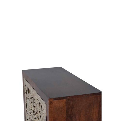 Ce qui rend ce meuble vraiment unique, c'est le travail minutieux de sculpture à la main qui orne chaque détail du meuble. Chaque motif sculpté est réalisé avec une grande attention aux détails, ajoutant une touche artisanale et authentique à cette pièce. Les deux portes du meuble sont somptueusement recouvertes de feuilles d'argent, créant ainsi un éclat argenté éblouissant. Cette finition en feuilles d'argent confère au meuble une esthétique luxueuse et prestigieuse, faisant de cette pièce un véritable bijou de décoration.