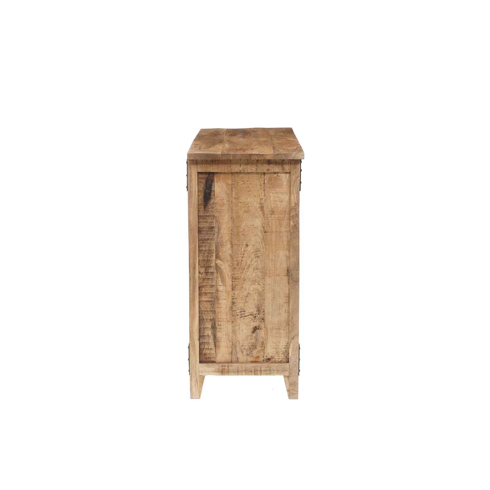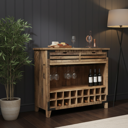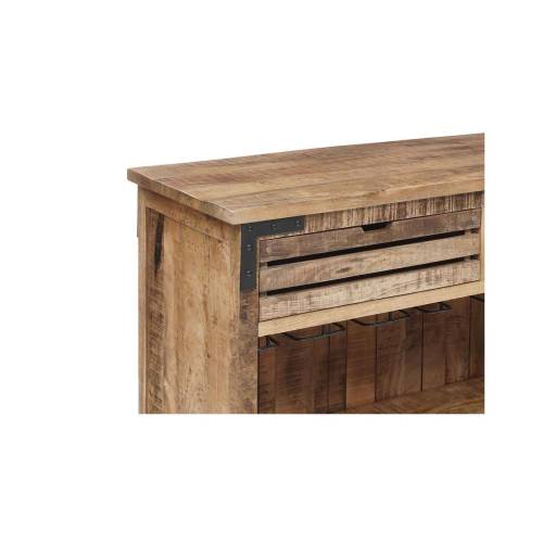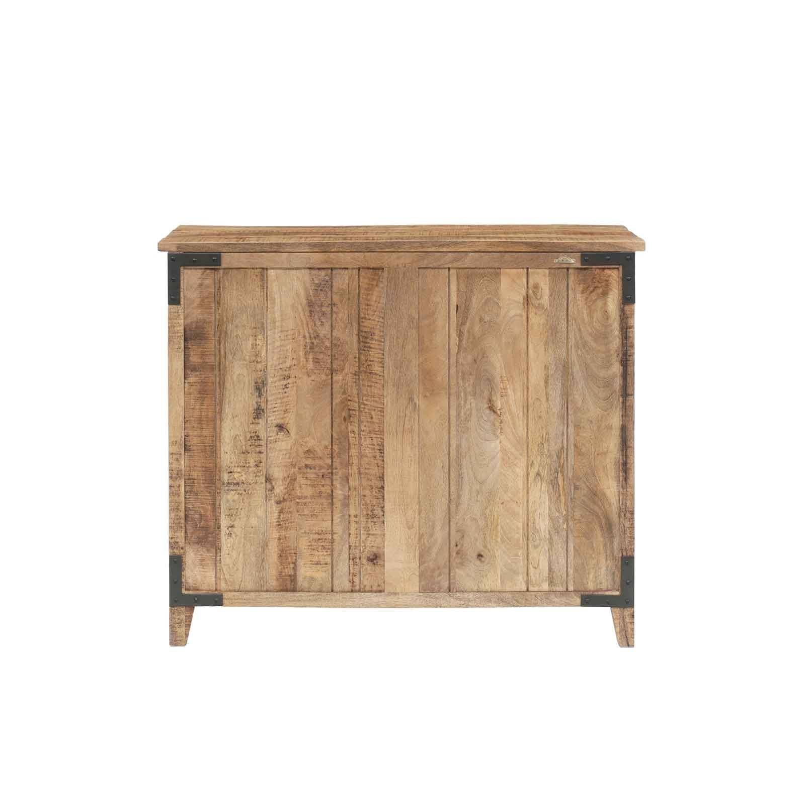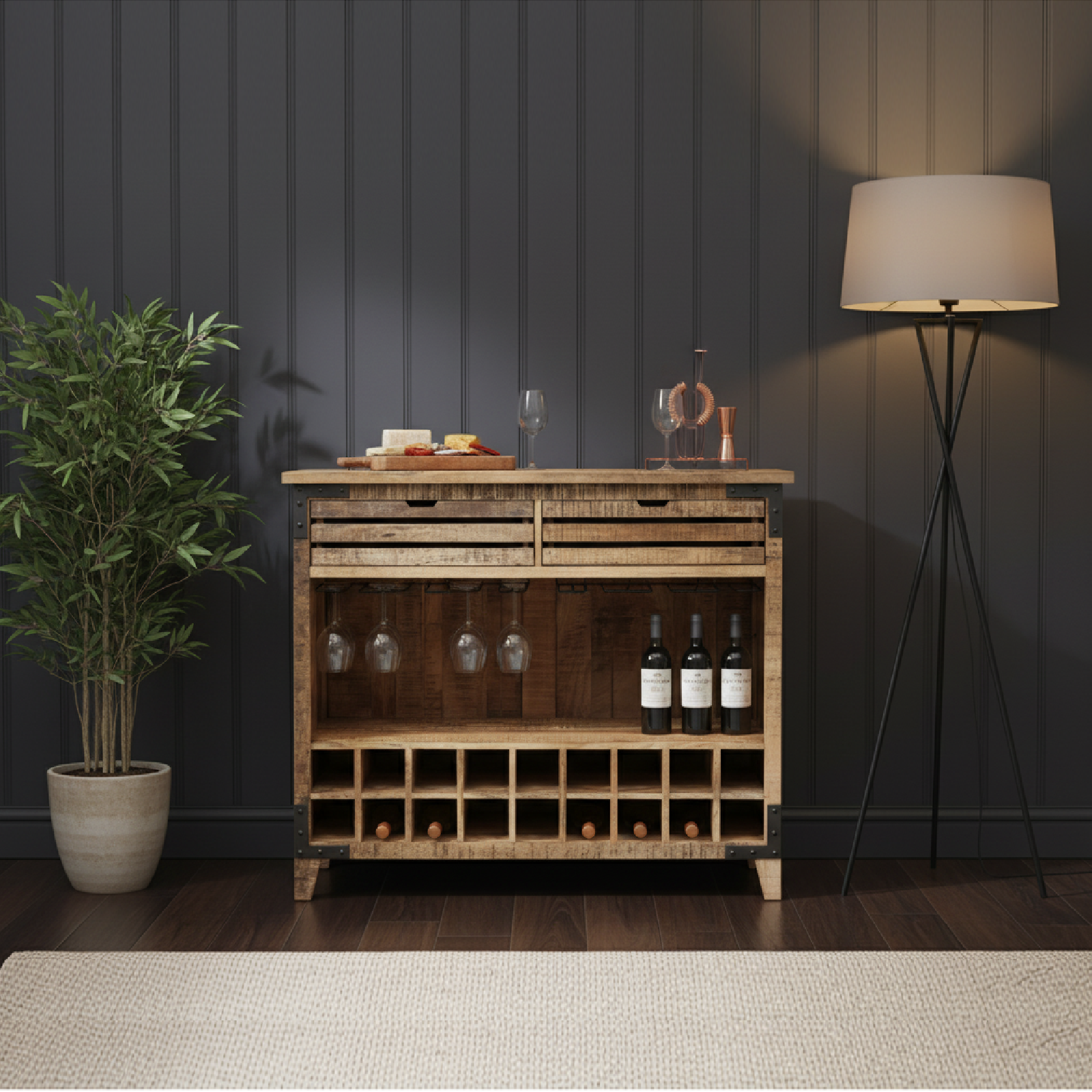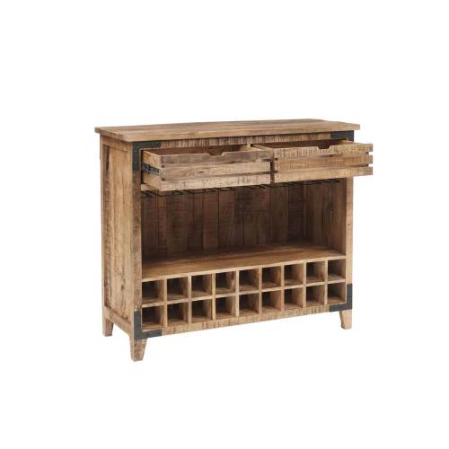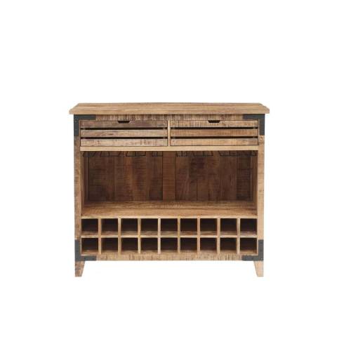 Le meuble bar 2 tiroirs de la collection Manguier Brut incarne l'élégance rustique et fonctionnelle en alliant la robustesse du bois à la modernité du métal.