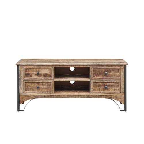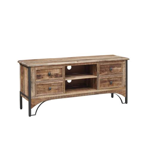 Avec ses 2 niches spacieuses, le meuble TV offre un espace généreux pour accueillir vos appareils multimédias, consoles de jeux, ou tout autre équipement électronique. Les 4 tiroirs ajoutent une dimension supplémentaire de rangement, permettant d'organiser vos accessoires et médias de manière ordonnée et accessible. L'association subtile du manguier massif et du métal confère à ce meuble TV un charme contemporain et industriel. Les pieds en métal robustes apportent une stabilité exemplaire, tout en accentuant le caractère moderne de la pièce.