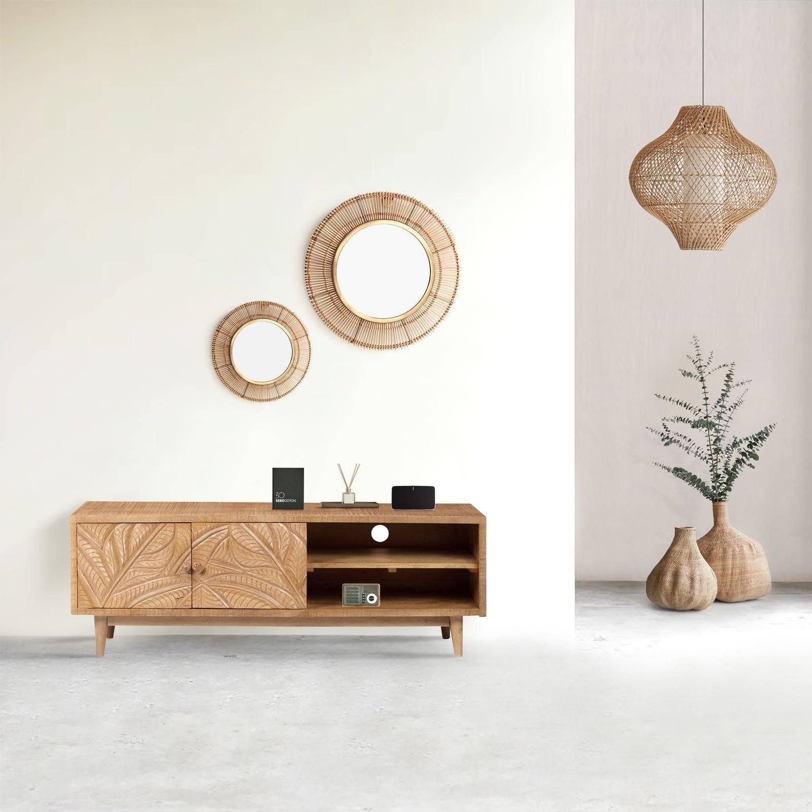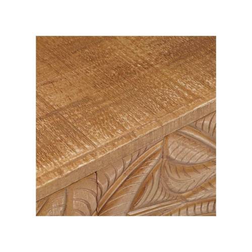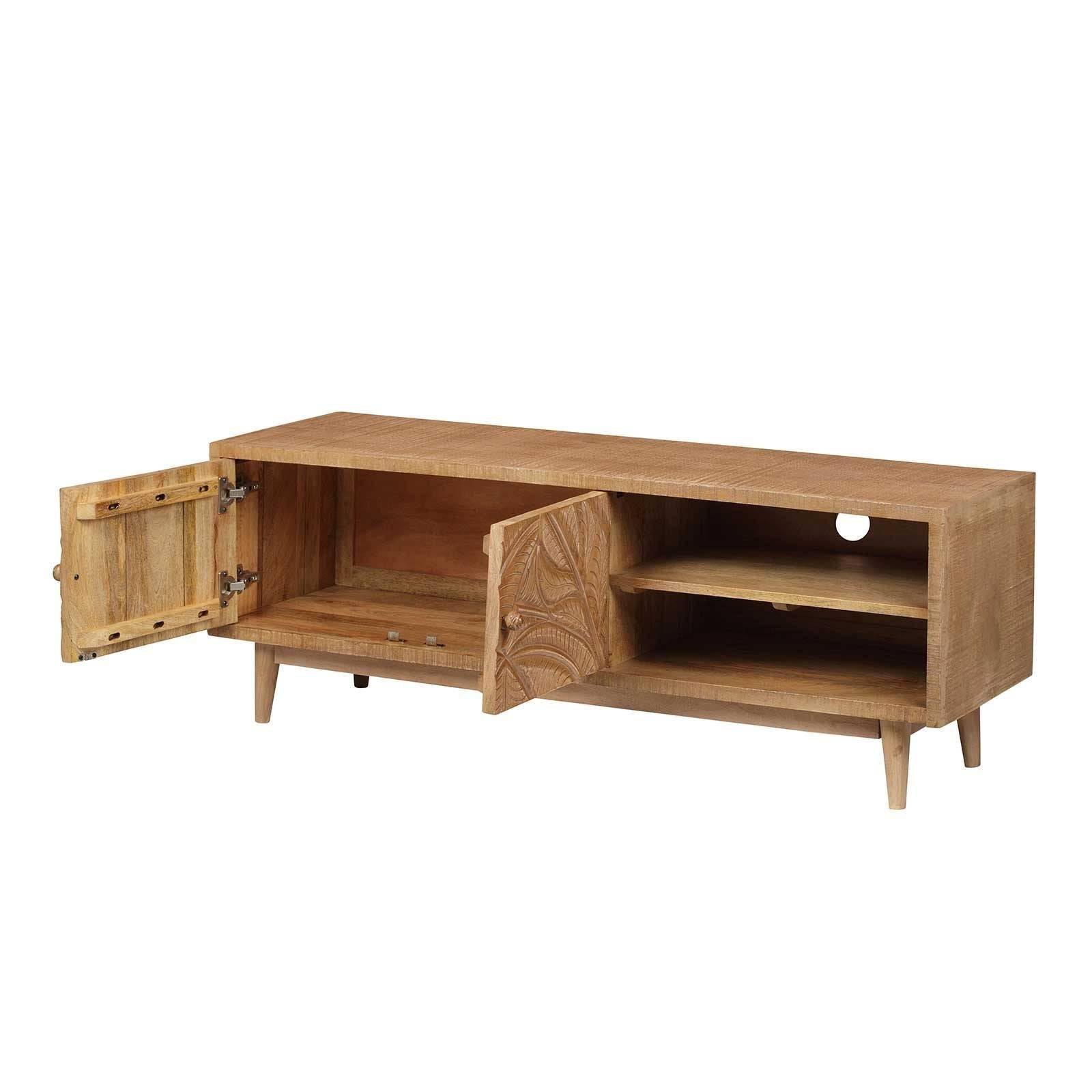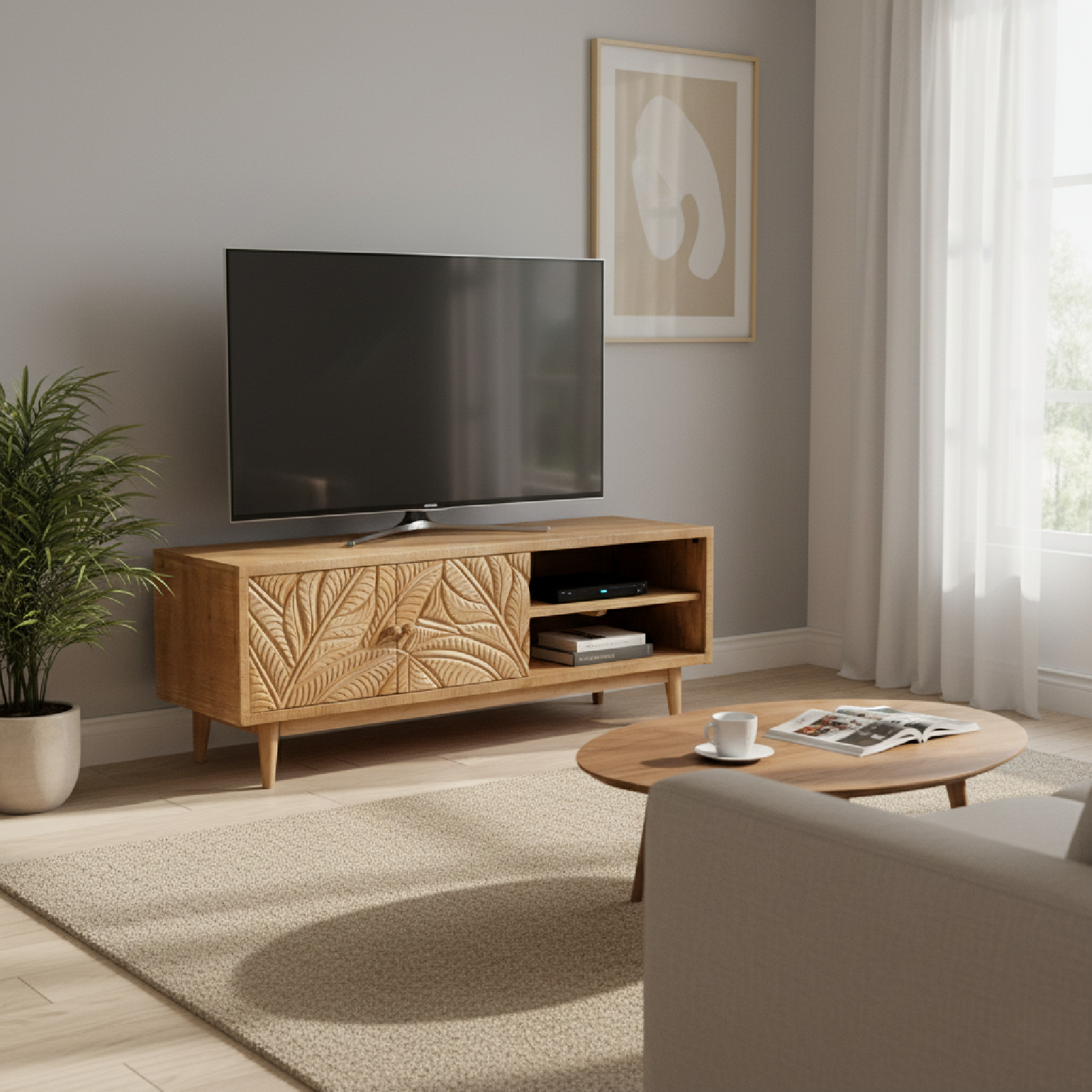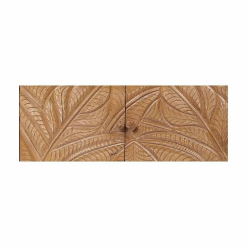 Ce meuble TV présente deux portes et deux niches, offrant ainsi un espace généreux pour ranger vos appareils électroniques, vos DVD et autres accessoires audiovisuels. Les portes en manguier massif, d'une épaisseur de 2,5 cm, sont ornées de sculptures artisanales réalisées à la main, ajoutant une touche de caractère unique à chaque pièce. L'étagère en manguier massif, d'une épaisseur de 1,5 cm, offre un soutien solide pour vos équipements tout en ajoutant une esthétique chaleureuse à l'ensemble. Le dos en MDF de 0,80 cm assure une stabilité structurelle tout en maintenant le poids total du meuble à un niveau optimal.