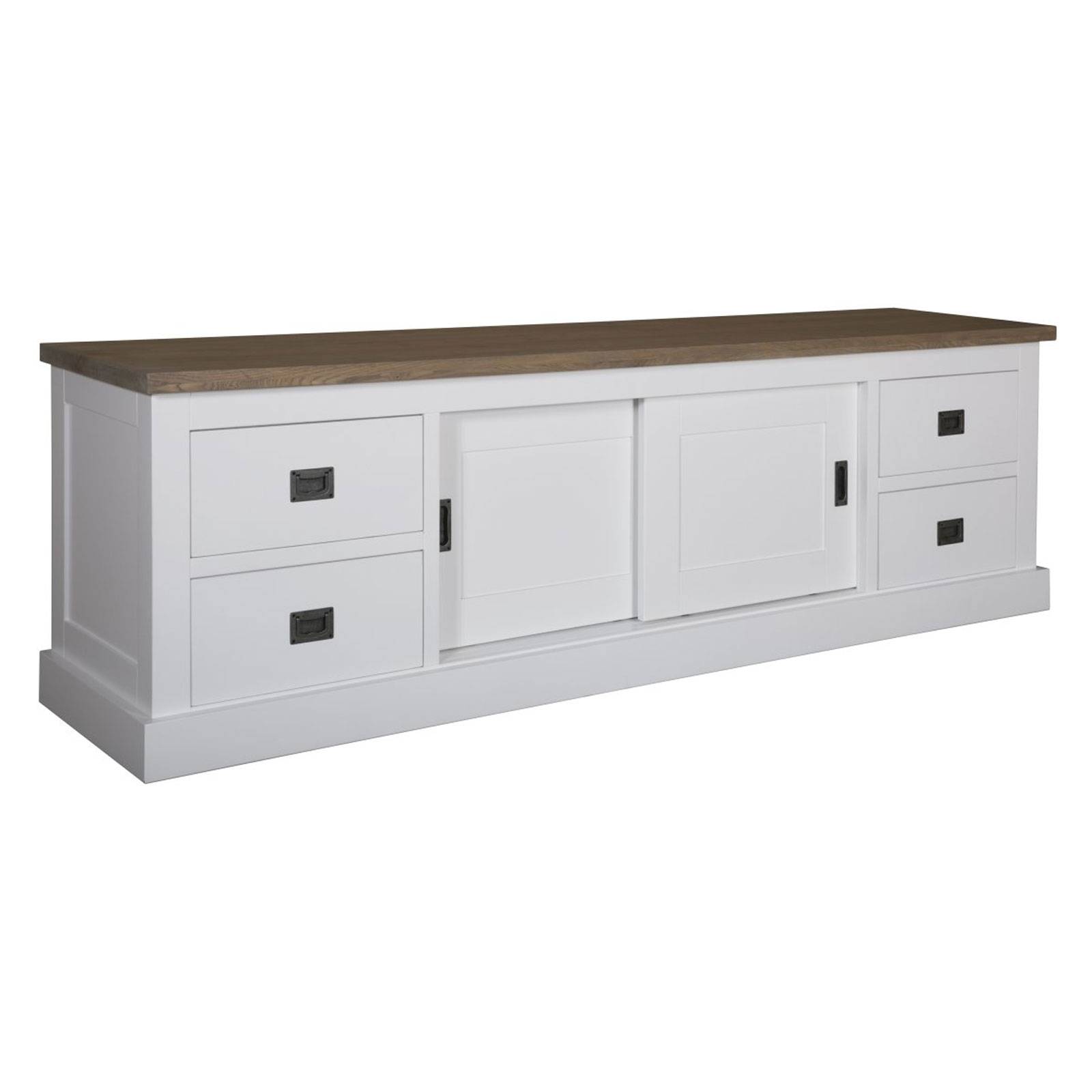 Inconditionnel du septième art ? Craquez pour ce grand meuble TV en pin et chêne massif qui complétera harmonieusement votre déco à l'esprit campagne chic ou bord de mer.