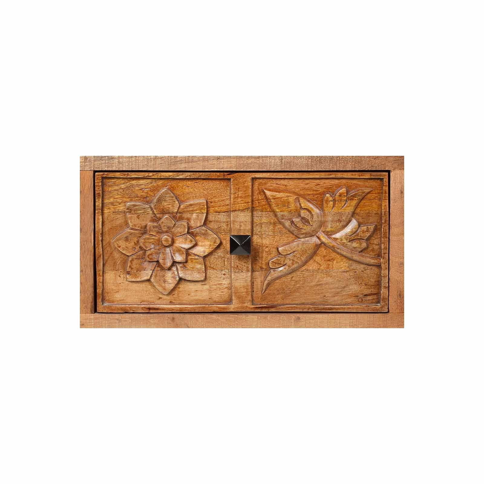 Les pieds en métal à la finition noir mat, ajoutent une touche de modernité tout en assurant une stabilité solide. Les sculptures minutieusement réalisées à la main sur les tiroirs, ornées de motifs floraux évocateurs, transportent l'imagination vers des contrées lointaines, invitant à l'évasion et au voyage. Que ce soit dans votre salon ou votre salle de séjour, le meuble TV 2 tiroirs, 1 niche de la collection Manguier Borealis est un meuble unique qui marie fonctionnalité et esthétique avec élégance. Avec son design soigné et ses détails artistiques, ce meuble ajoute une touche de charme exotique et d'authenticité à votre salon.