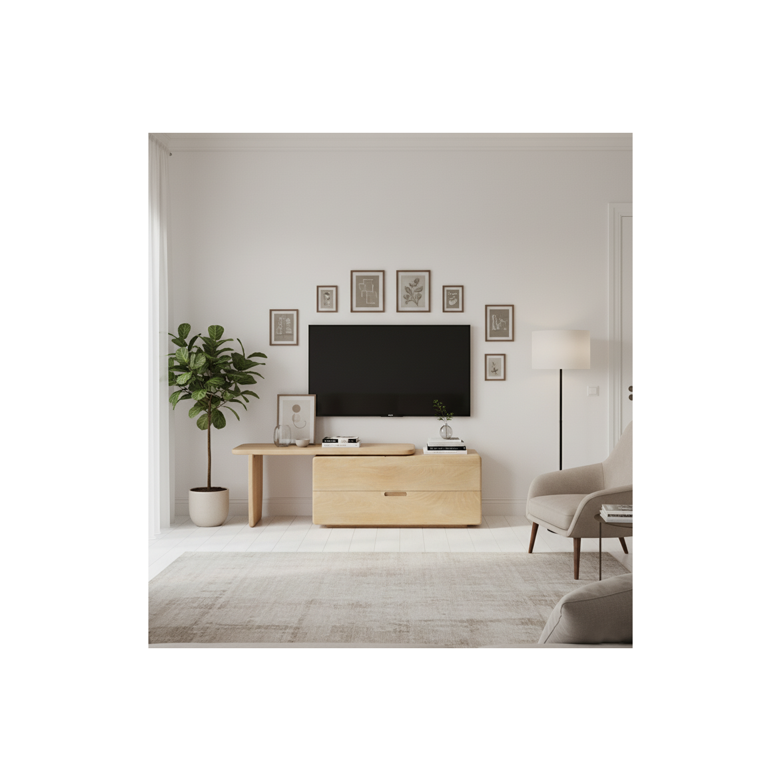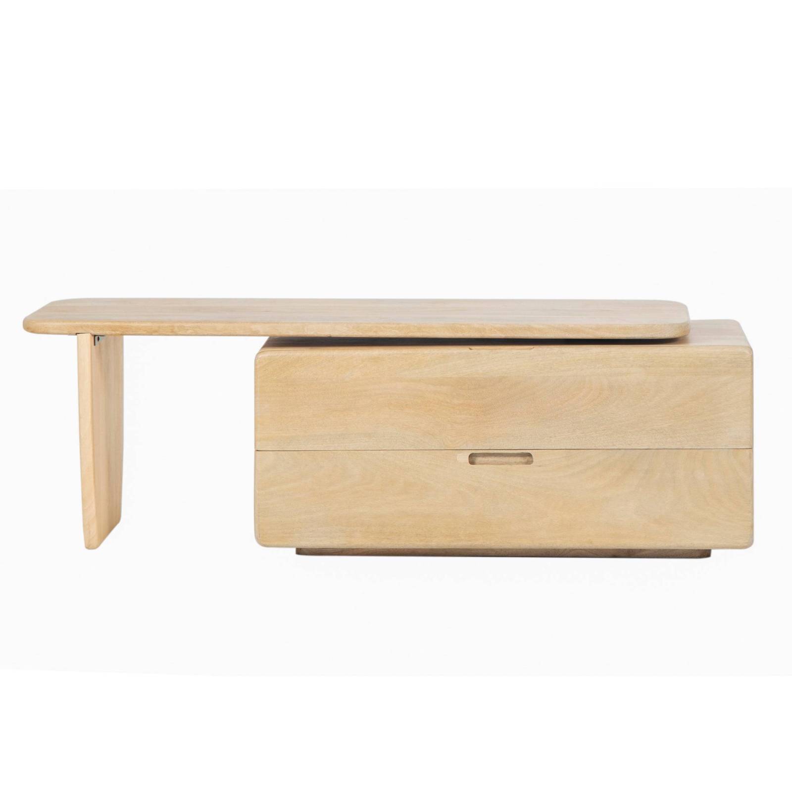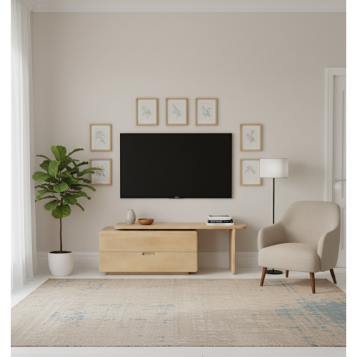 Le meuble dispose de deux grands tiroirs avec poignées intégrées découpées, offrant un rangement discret pour les accessoires multimédias, les télécommandes et les objets du quotidien. Ses angles délicatement arrondis et ses lignes sculpturales créent une silhouette minimaliste adoucie, tandis que sa configuration asymétrique, combinant un module de rangement et un support à base ouverte, ajoute un intérêt architectural et un équilibre visuel.