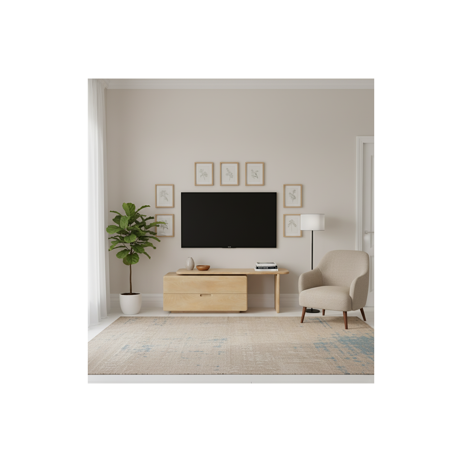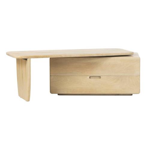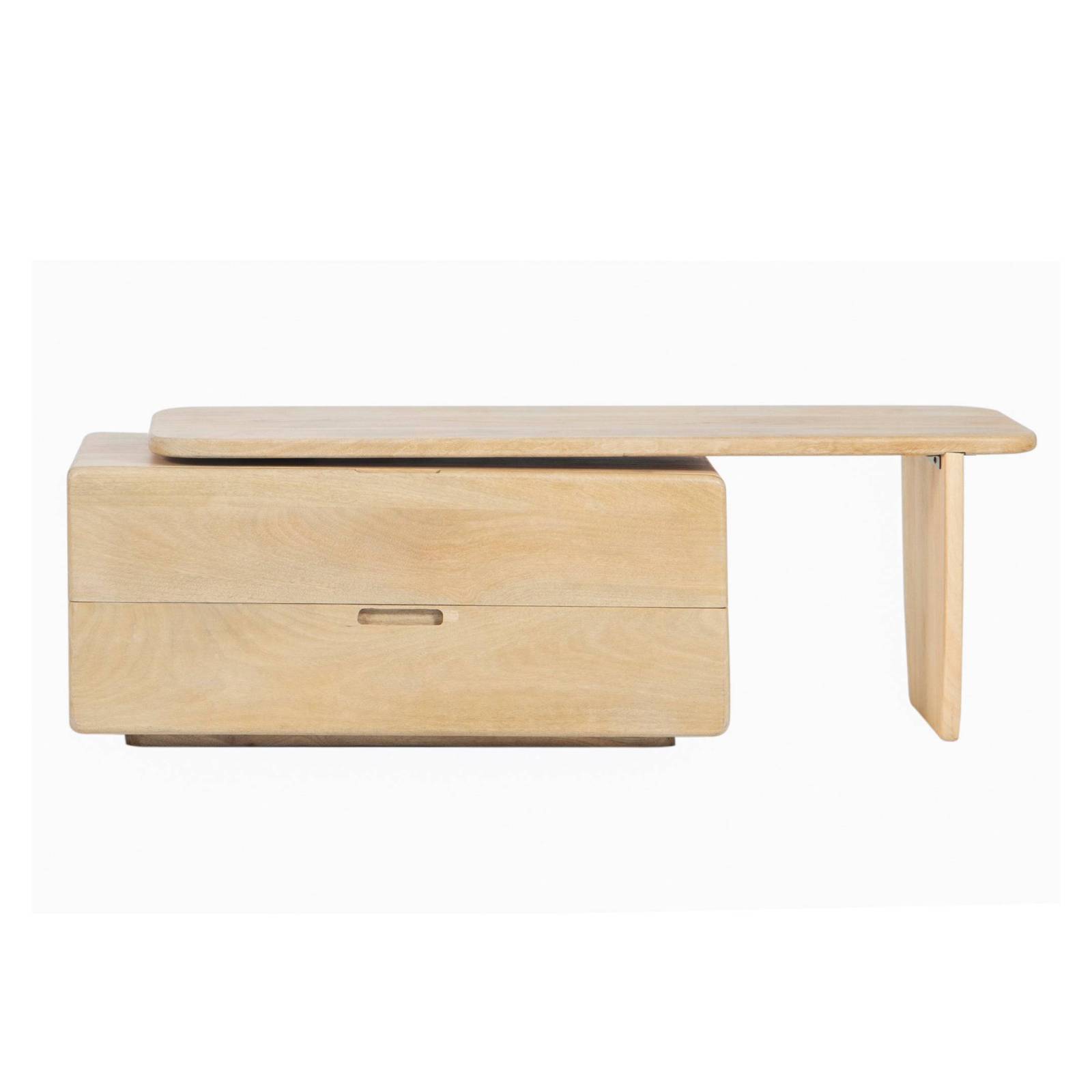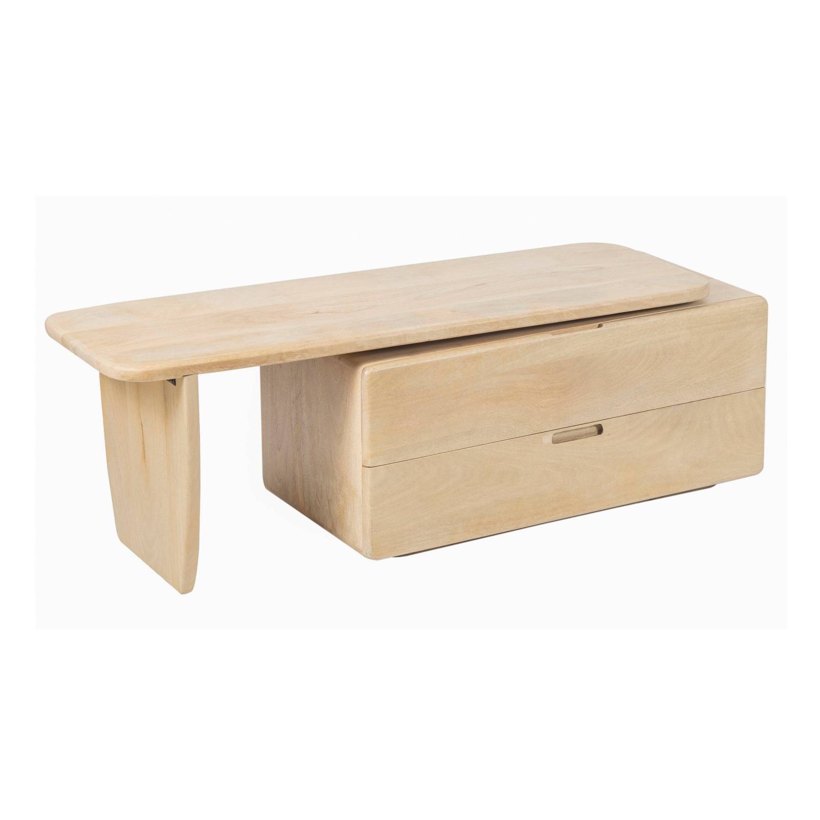 Le meuble dispose de deux grands tiroirs avec poignées intégrées découpées, offrant un rangement discret pour les accessoires multimédias, les télécommandes et les objets du quotidien. Ses angles délicatement arrondis et ses lignes sculpturales créent une silhouette minimaliste adoucie, tandis que sa configuration asymétrique, combinant un module de rangement et un support à base ouverte, ajoute un intérêt architectural et un équilibre visuel.