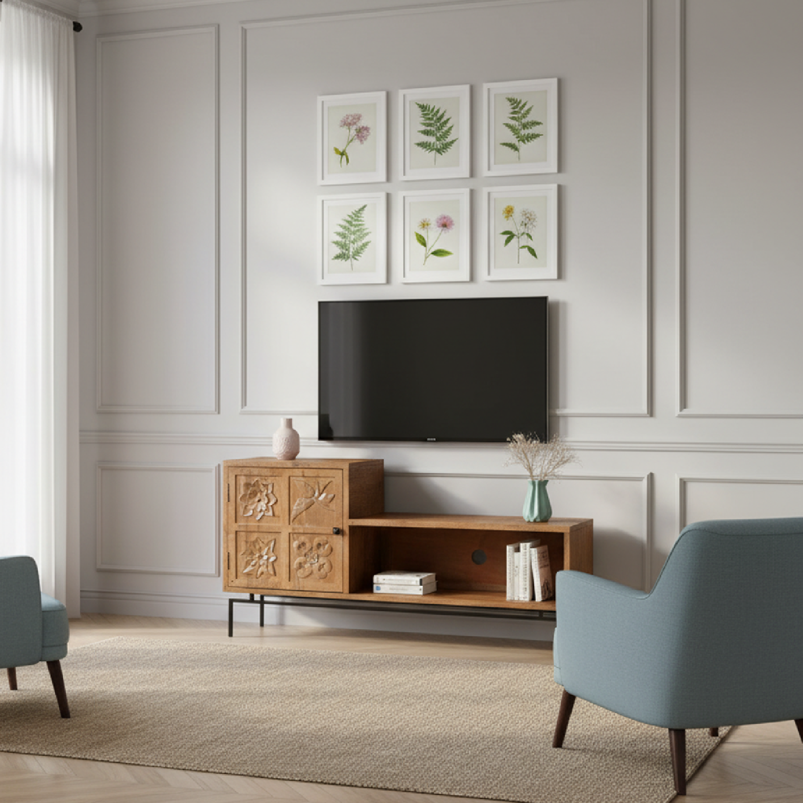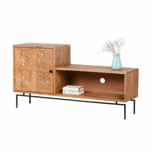 Les pieds en métal à la finition noir mat, ajoutent une touche de modernité tout en assurant une stabilité solide. Les sculptures délicates réalisées à la main sur la porte, ornées de motifs floraux évocateurs, éveillent l'imagination et invitent à l'évasion vers des contrées lointaines. Que ce soit dans un salon moderne ou une pièce de détente, le meuble TV asymétrique de la collection Manguier Borealis est un indispensable qui allie fonctionnalité et esthétique avec audace. Avec son design innovant et ses détails artistiques, ce meuble offre une expérience visuelle unique et enrichissante, ajoutant une touche de style contemporain à votre salon.