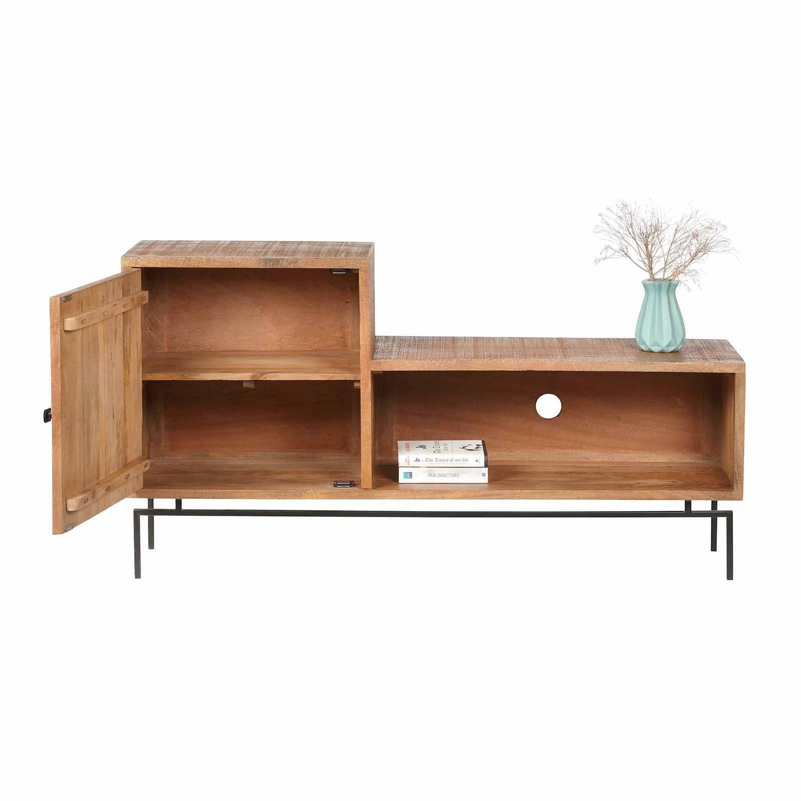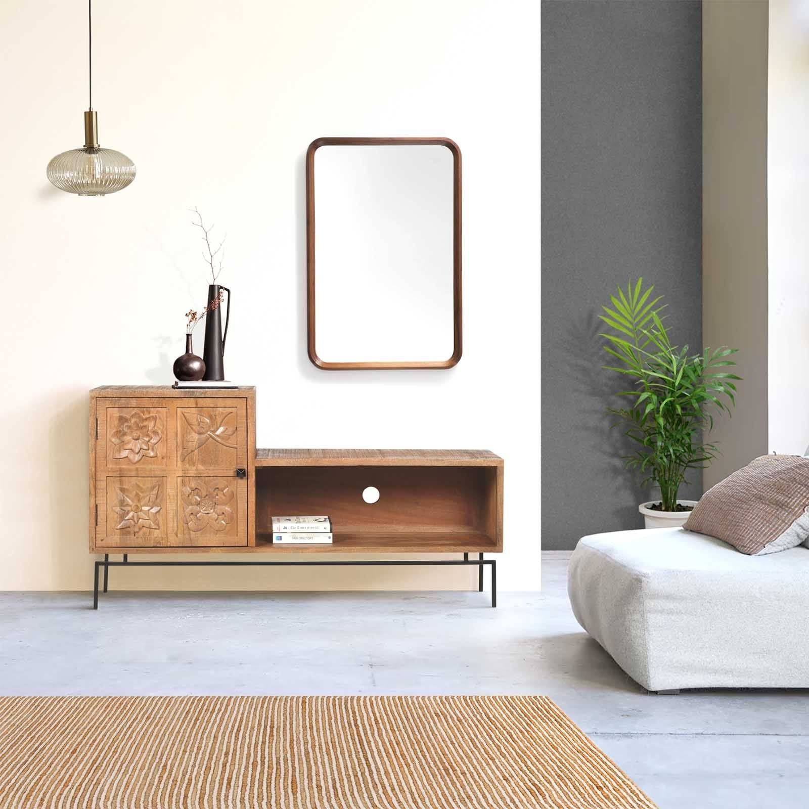 Découvrez l'audace du design contemporain et l'authenticité du savoir-faire artisanal avec le meuble TV asymétrique 1 porte de la collection Manguier Borealis.