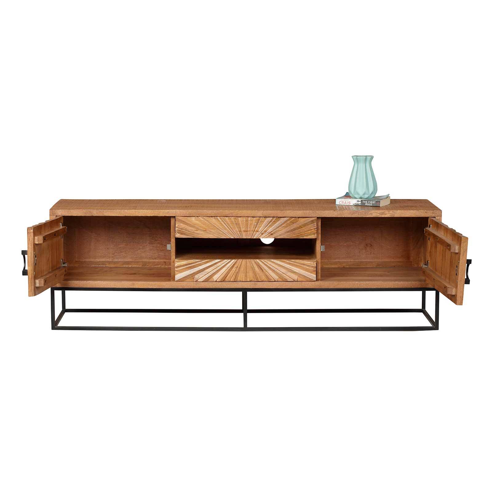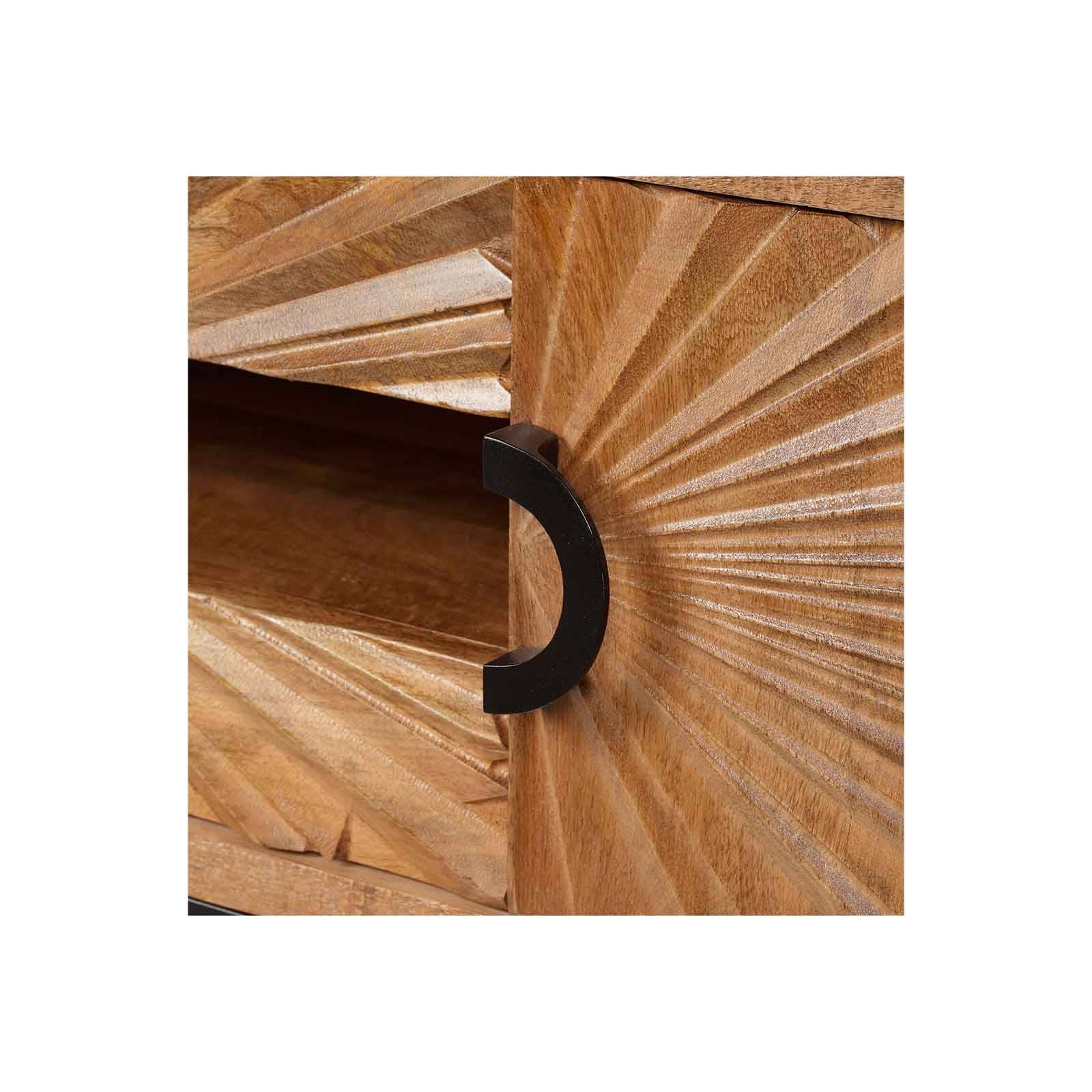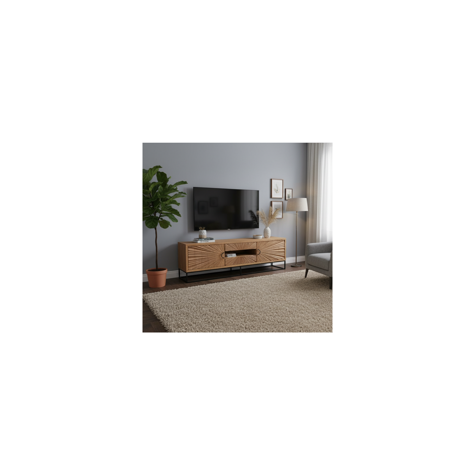 L'élément le plus saisissant de ce meuble TV avec rangements réside dans sa façade sculptée, formée en rayons évoquant la splendeur du soleil. Cette caractéristique distinctive, qui donne son nom à la collection, apporte une touche artistique et une ambiance chaleureuse à votre salon, créant ainsi une décoration au style unique. Fonctionnel et élégant, le meuble TV avec rangements de la collection Manguier Solis est un choix parfait pour compléter votre salon ou votre espace multimédia, ajoutant à la fois style et praticité à votre décor.