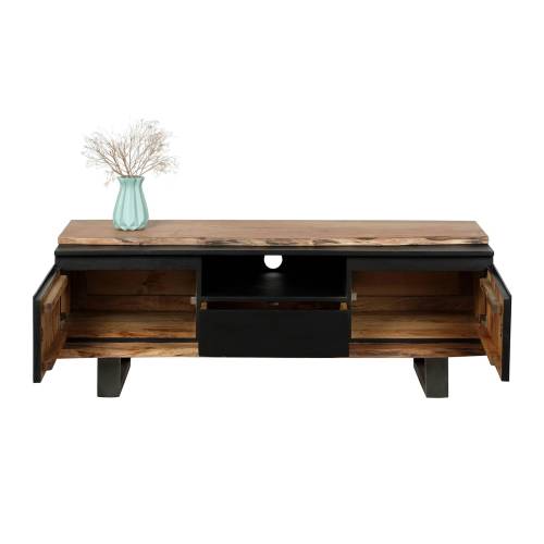 Doté de deux portes, un tiroir et deux portes avec étagère intérieure, ce meuble offre un espace généreux pour ranger vos appareils électroniques, vos DVD ou vos consoles de jeux. Sa structure en bois massif de manguier assure une solidité remarquable, tandis que son plateau en acacia massif ajoute une touche de raffinement naturel à votre salon. Le dos en MDF assure une stabilité supplémentaire, tandis que les pieds en métal livrés démontés confèrent une allure contemporaine et légère.