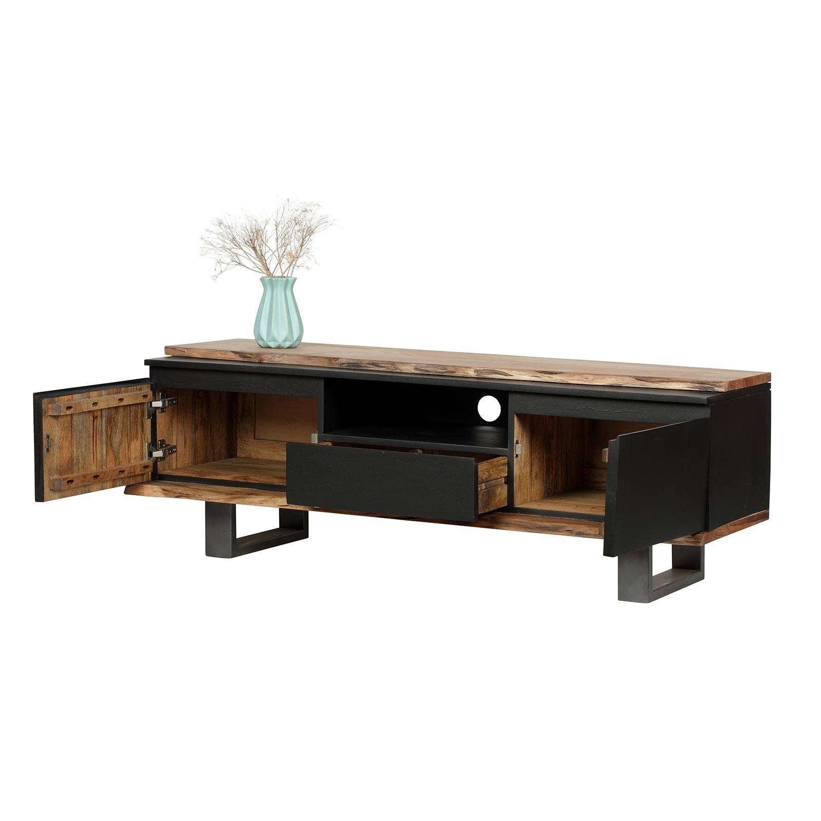 Découvrez l'élégance intemporelle du meuble TV bas noir au design contemporain. Fabriqué en acacia massif, manguier massif et métal ce meuble est robuste.