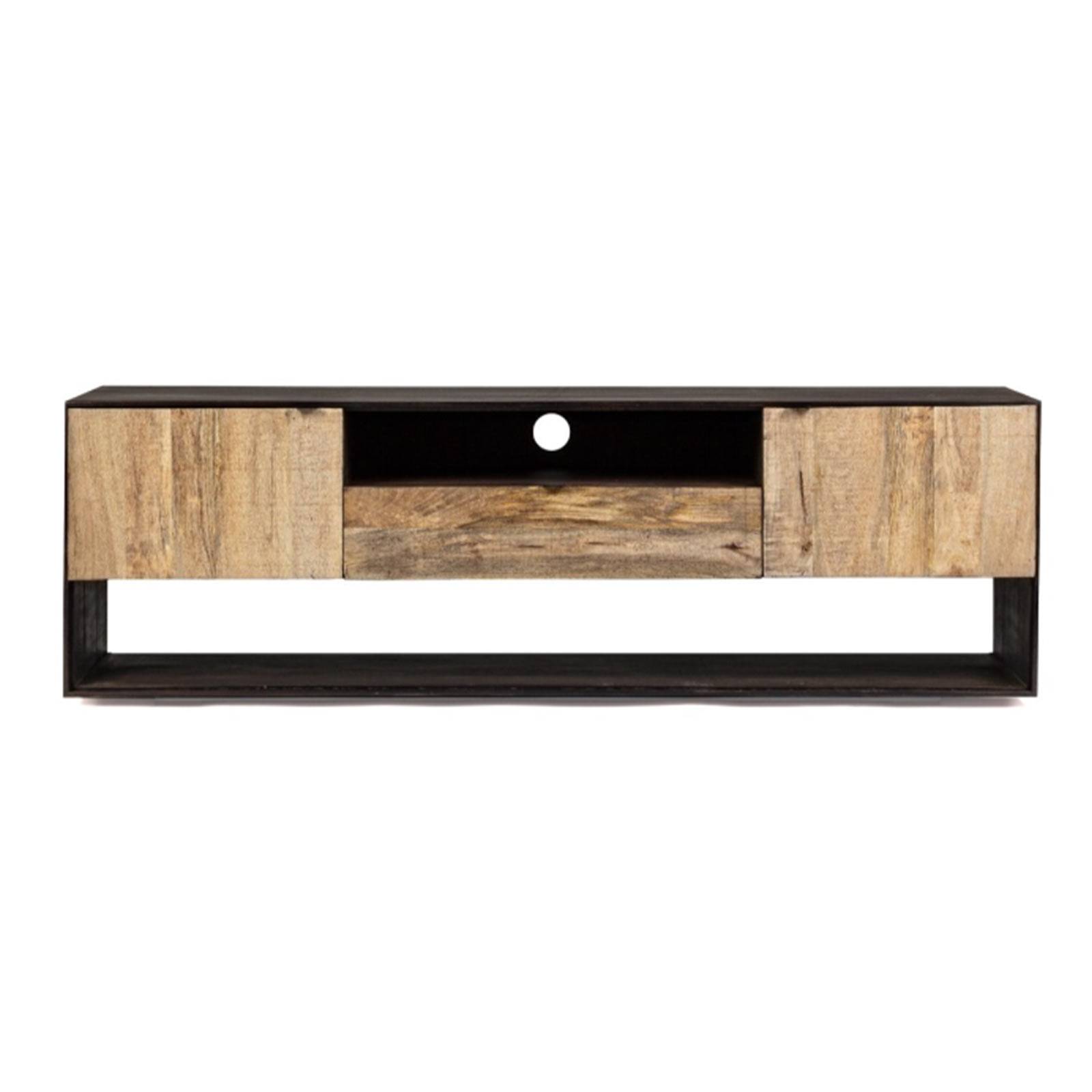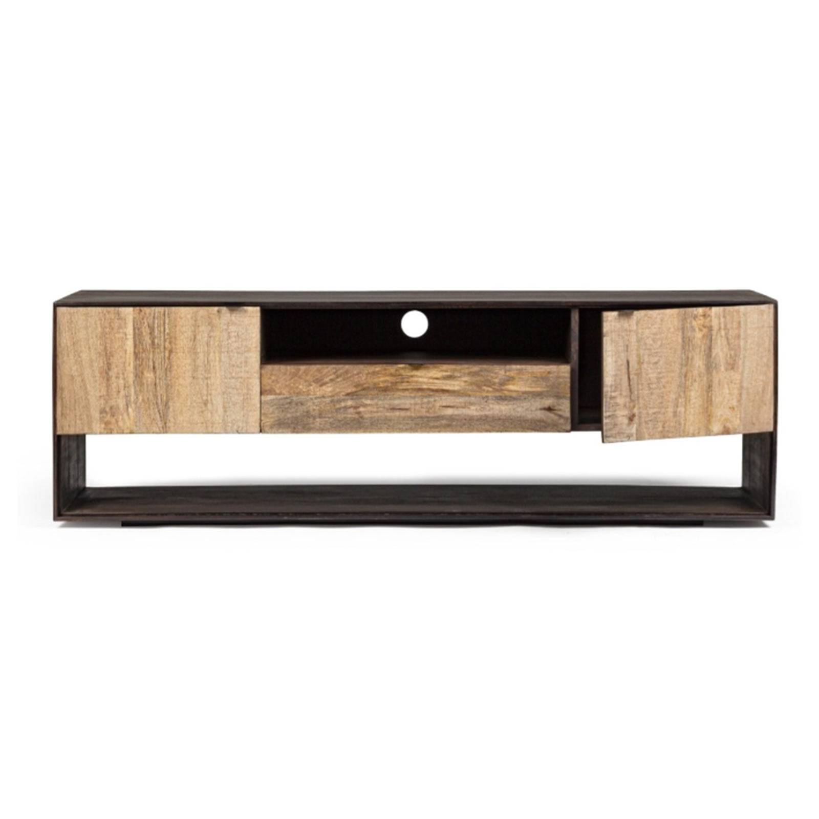 Découvrez l'élégance moderne avec le meuble TV bicolore fabriqué à partir de manguier riche en caractère, d'acacia robuste et de métal contemporain.