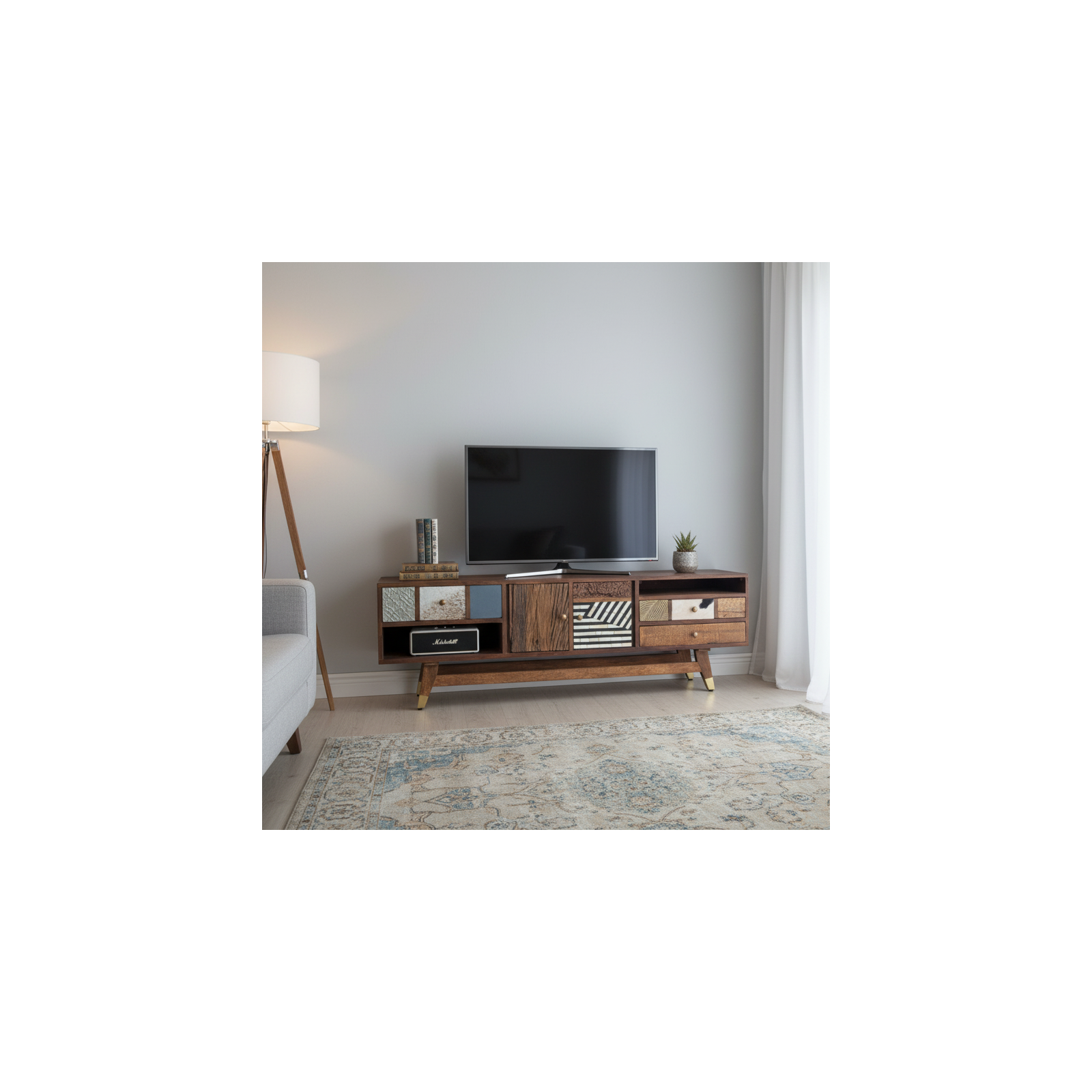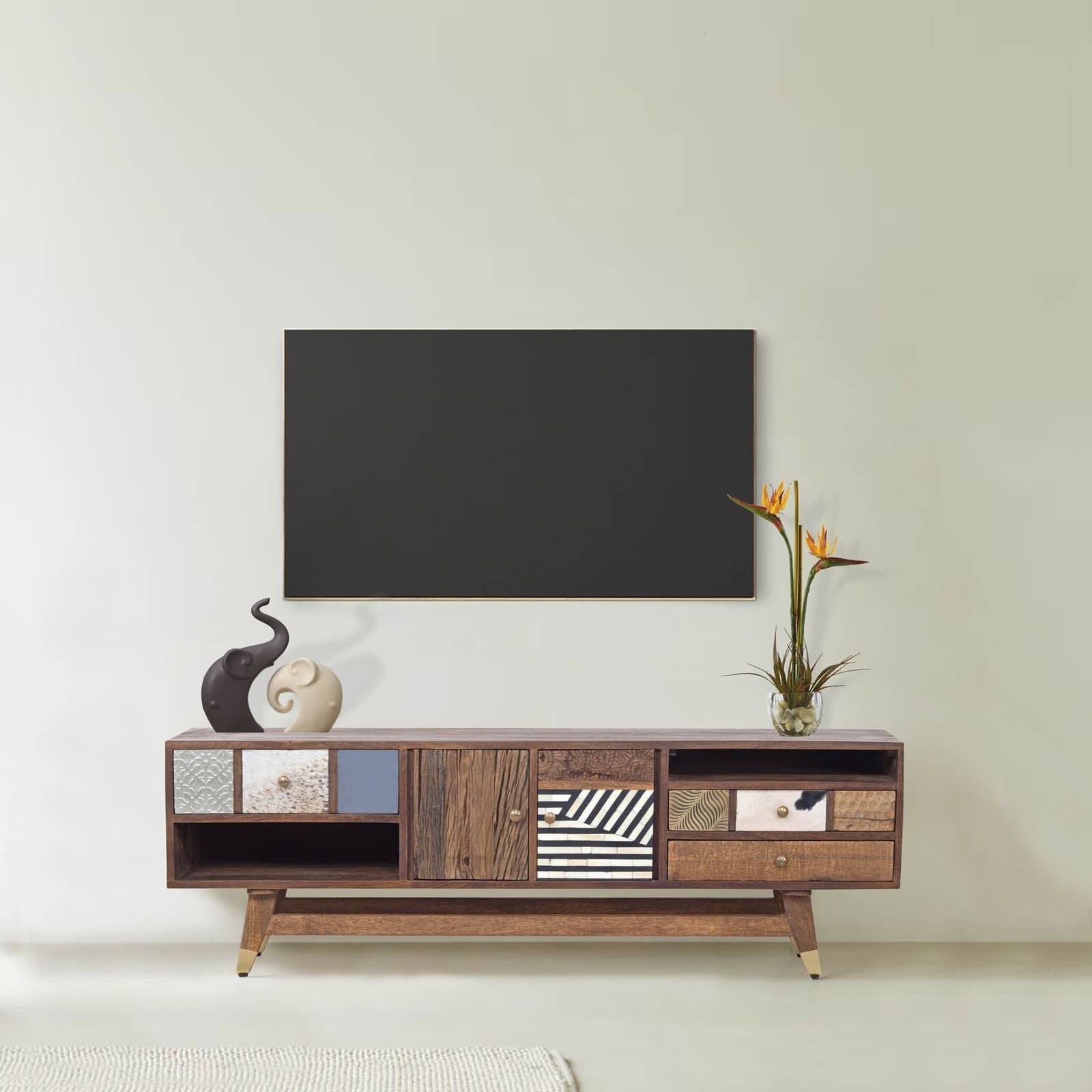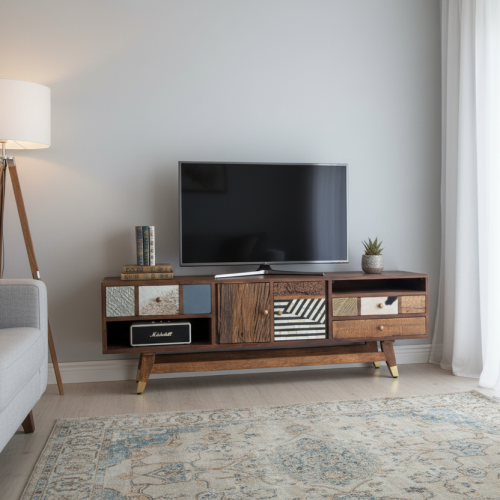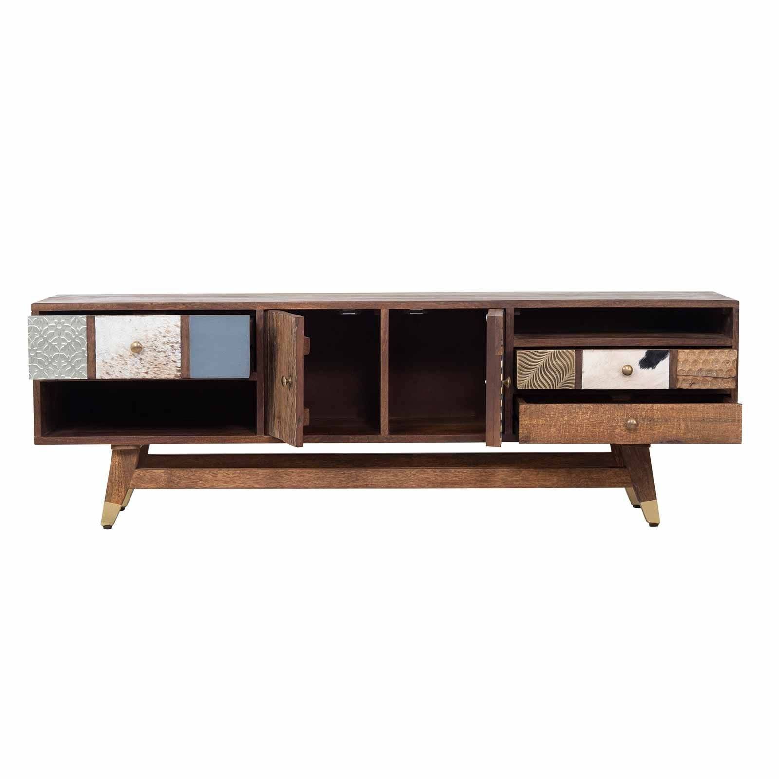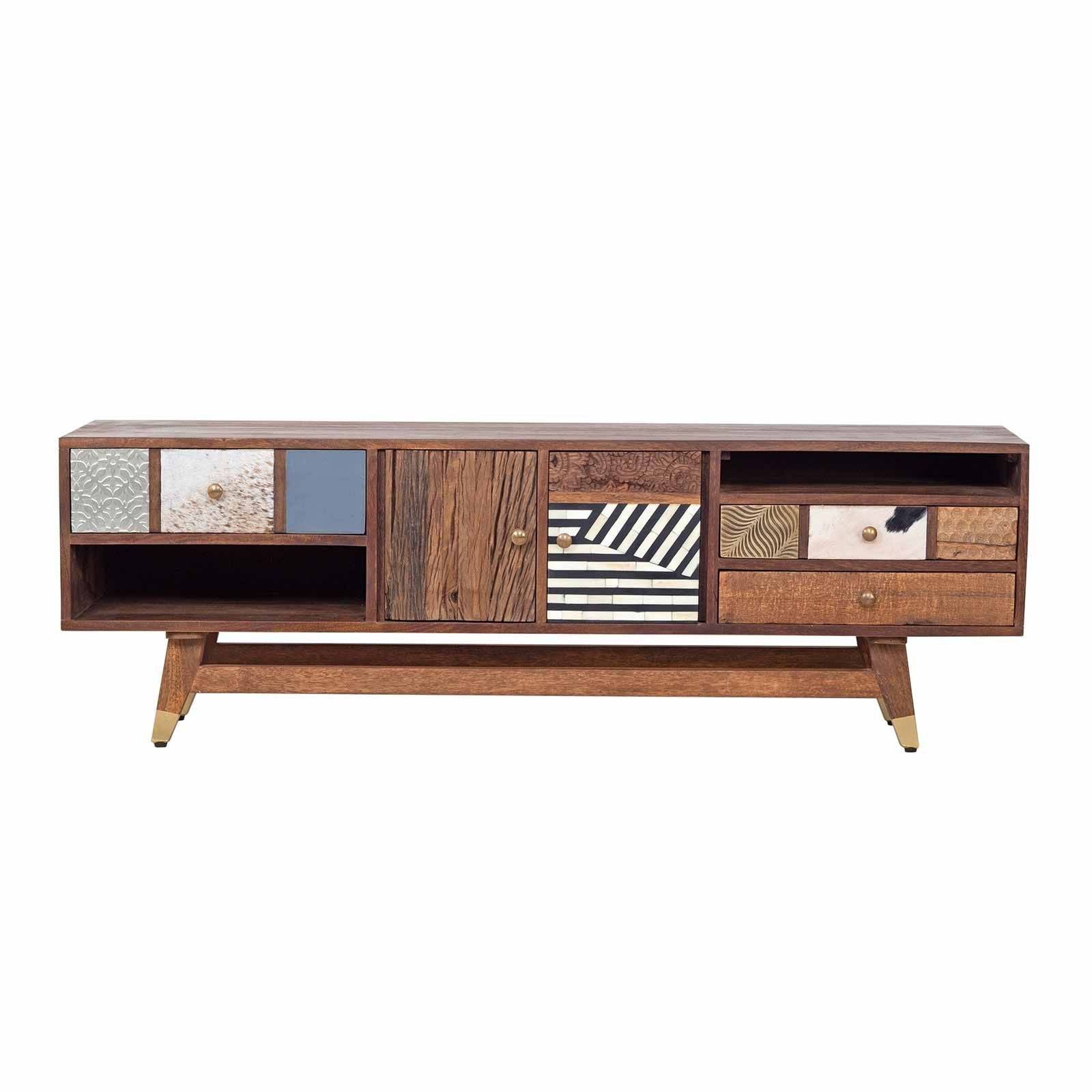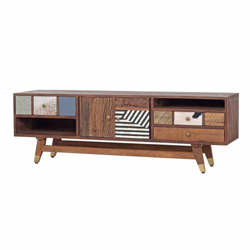 Le meuble TV bois de manguier incarne l'essence même de l'élégance exotique. Sa principale caractéristique est sa façade multi matériaux.