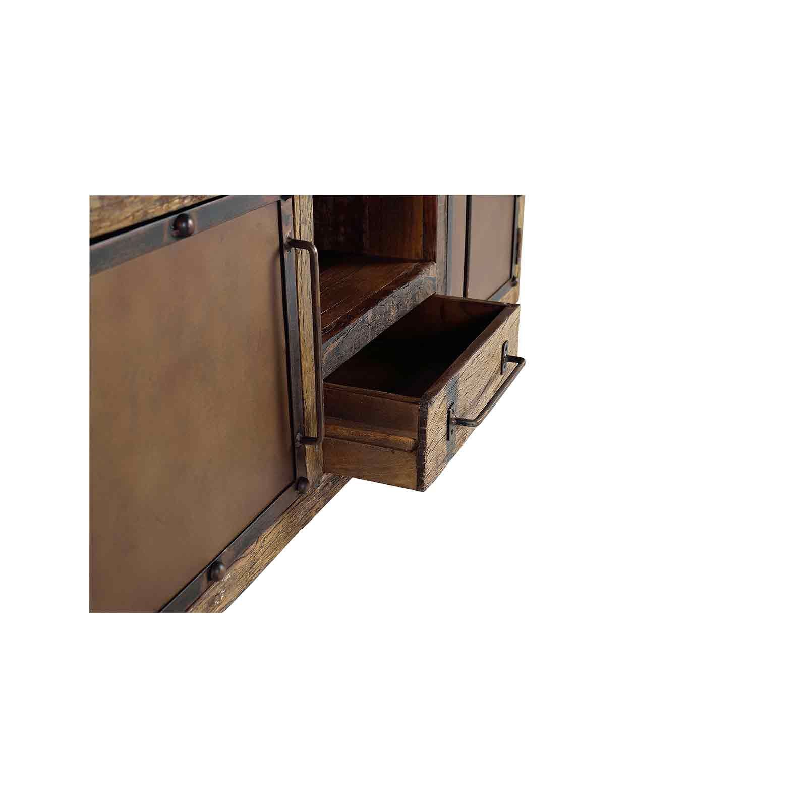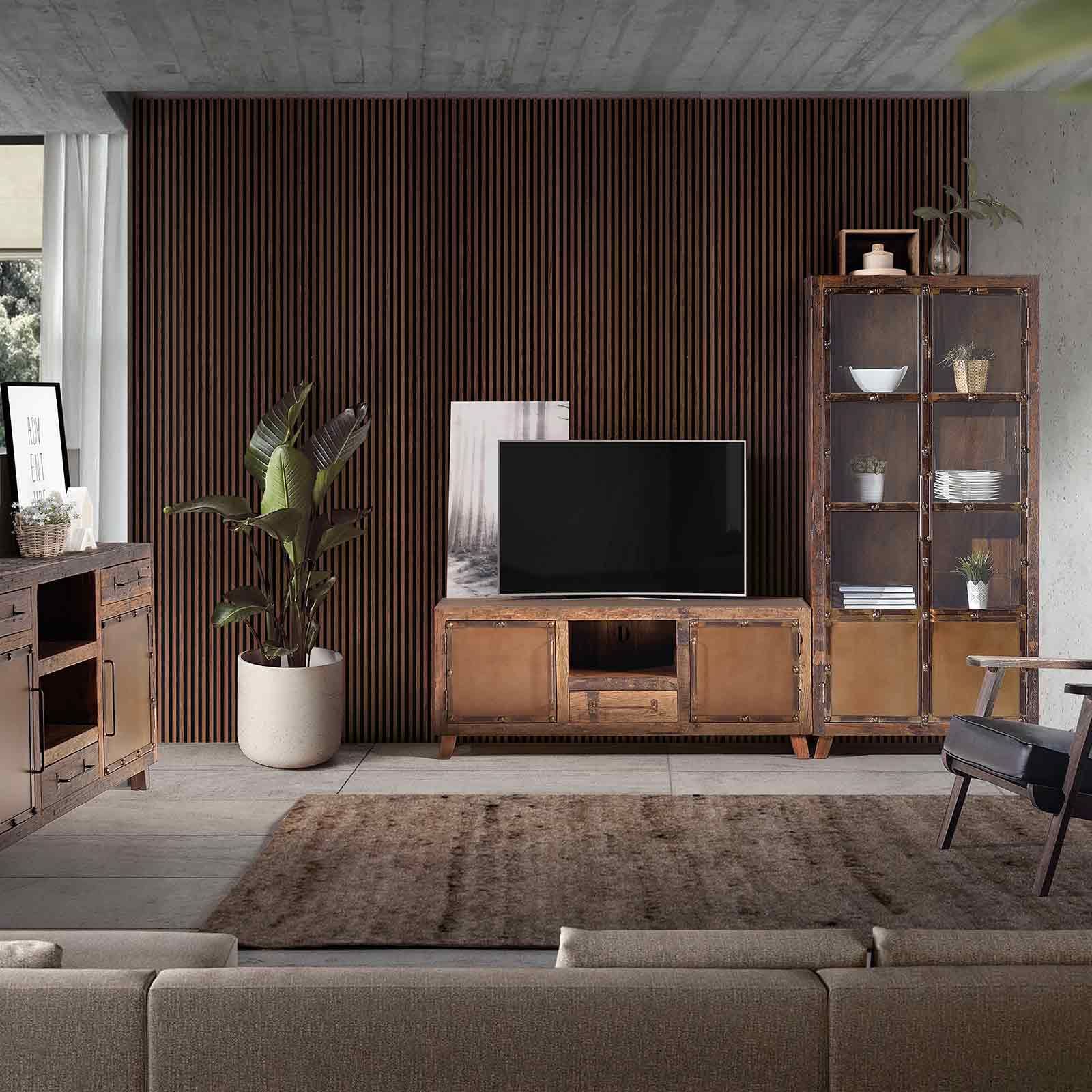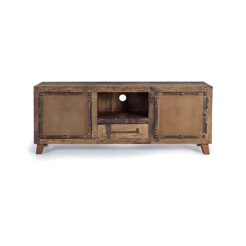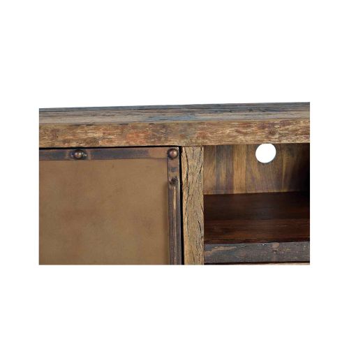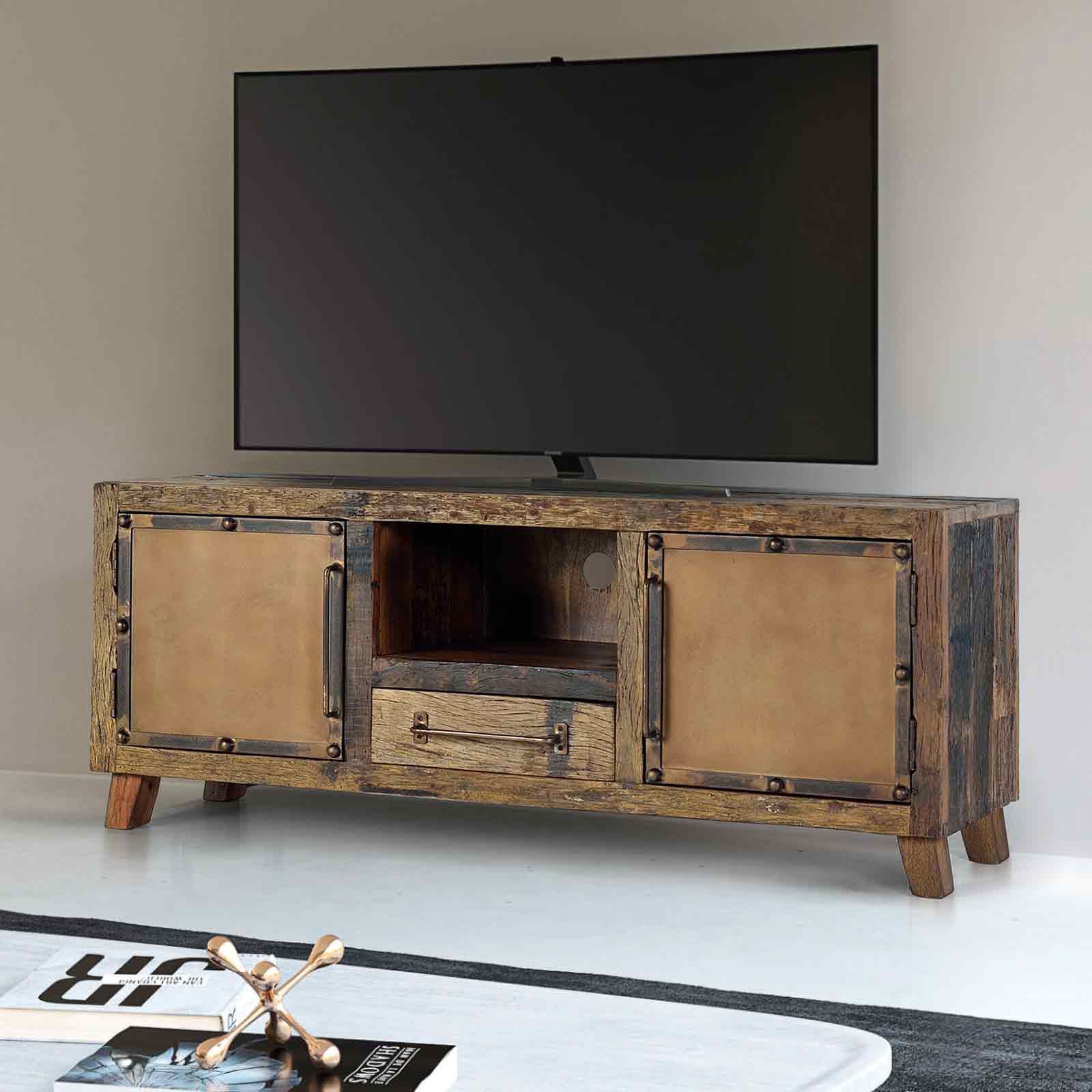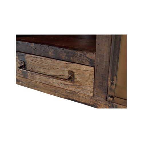 Le meuble TV bois recycle incarne un style industriel rétro unique, alliant harmonieusement le bois de chemin de fer recyclé et le métal. Idéal pour le salon.