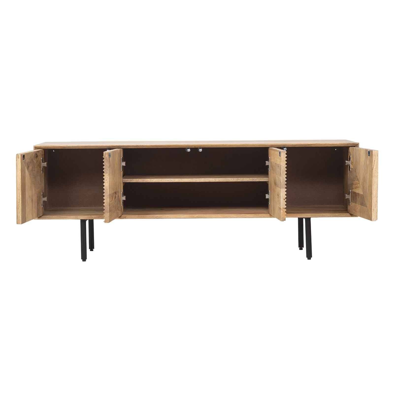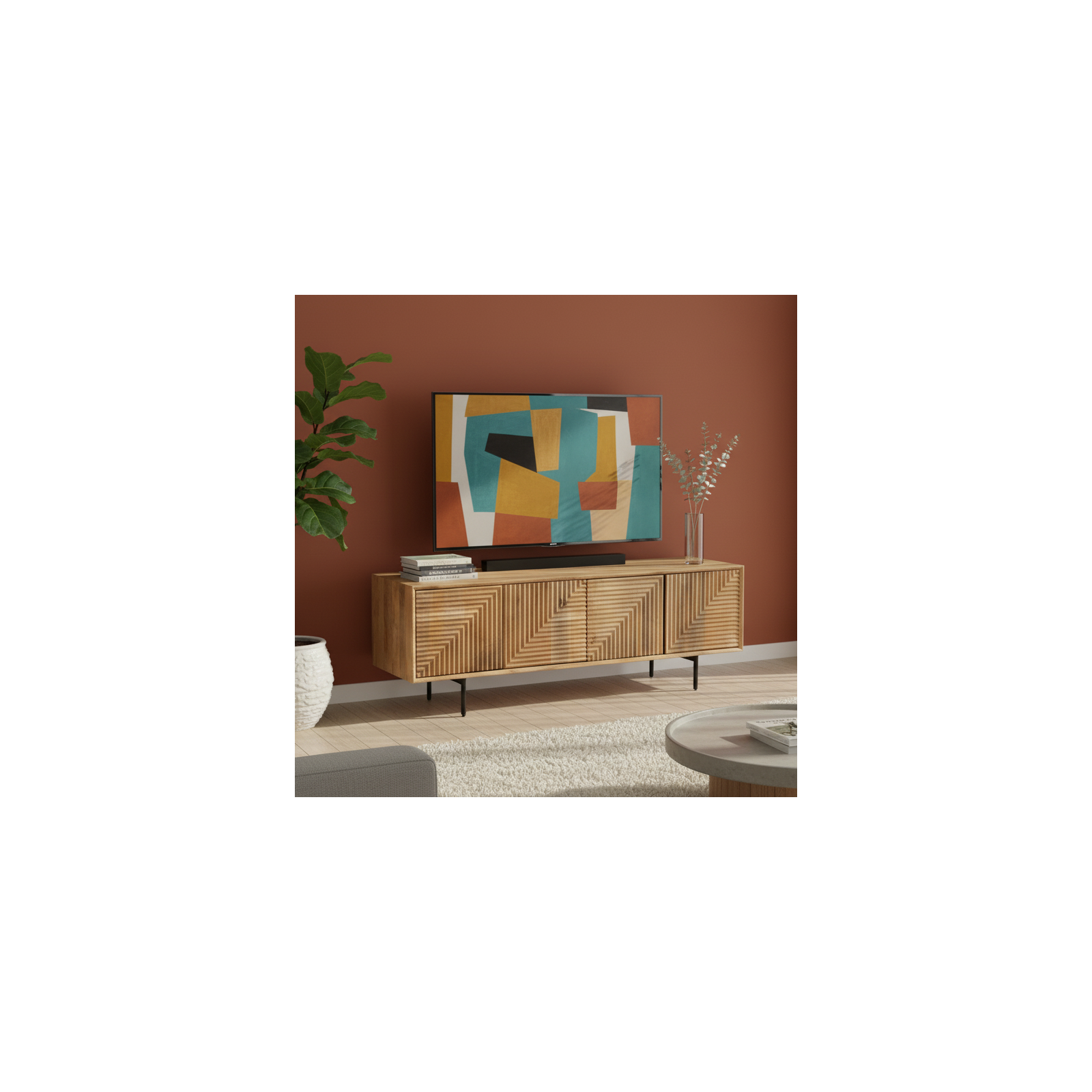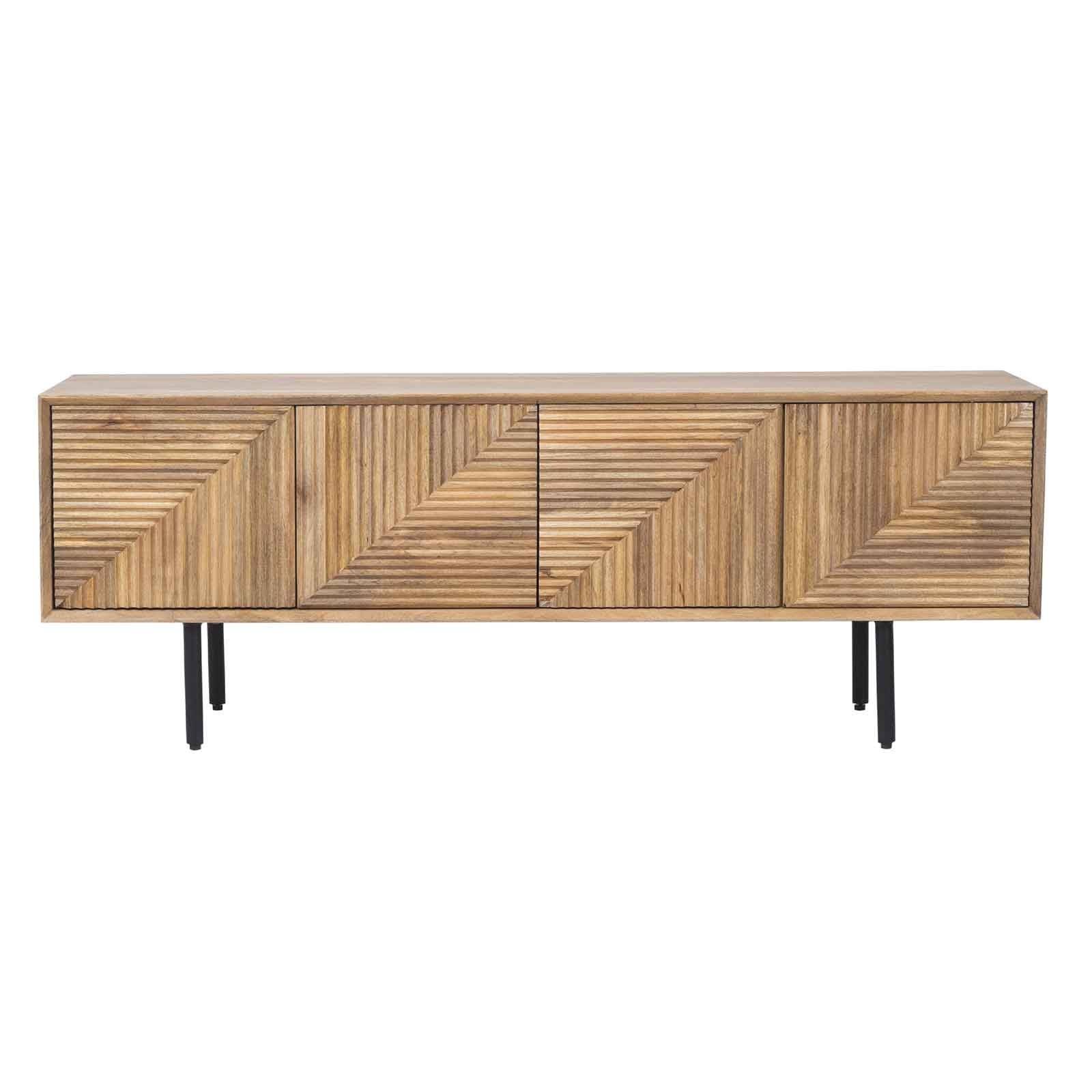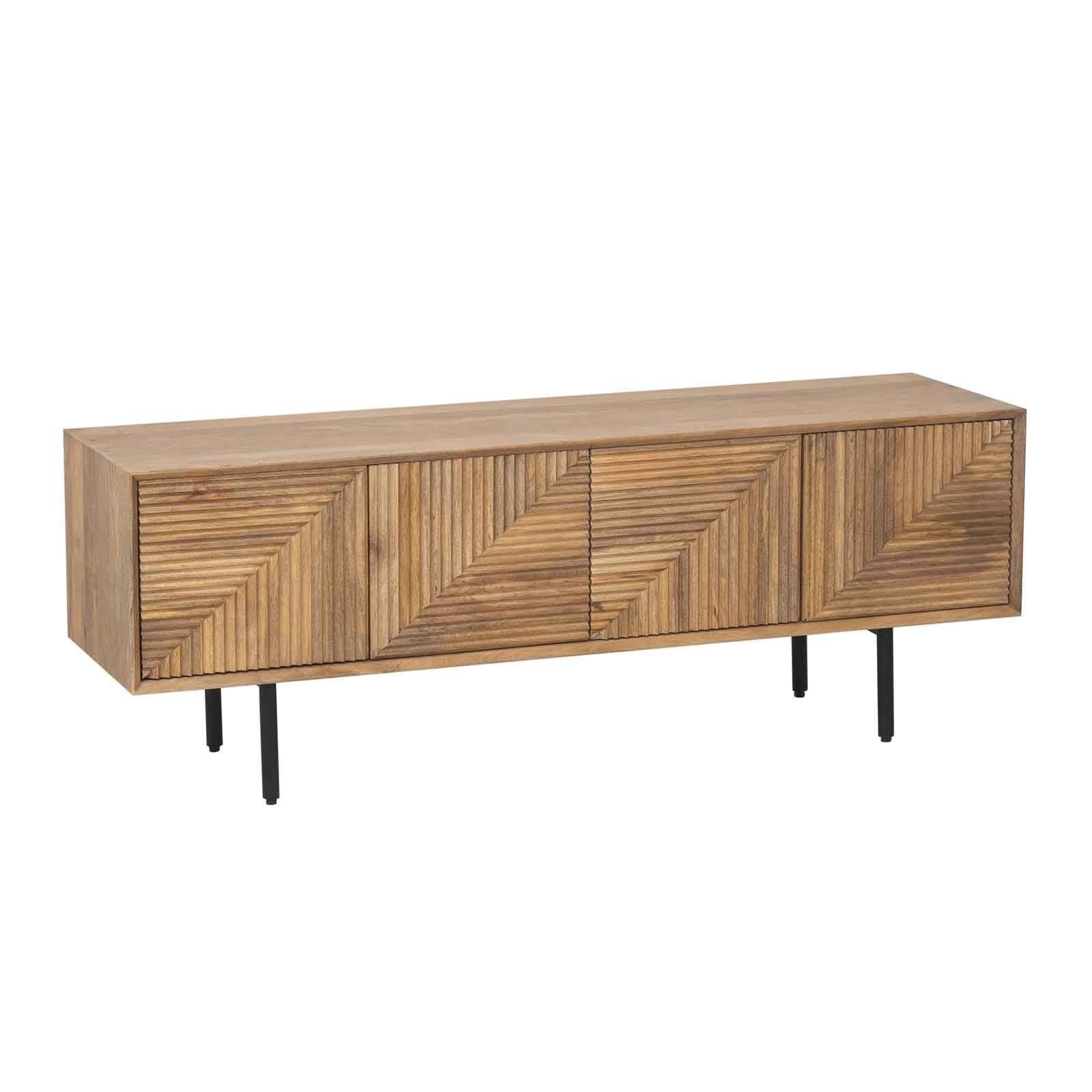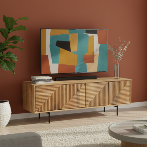 Le meuble TV bois sculpté en manguier massif est une pièce d'ameublement exceptionnelle qui incarne la robustesse et l'exotisme.
