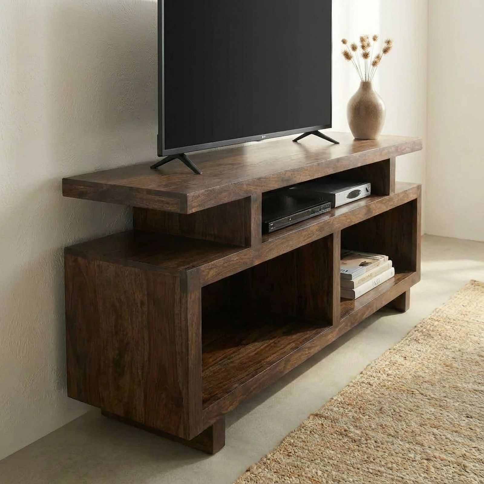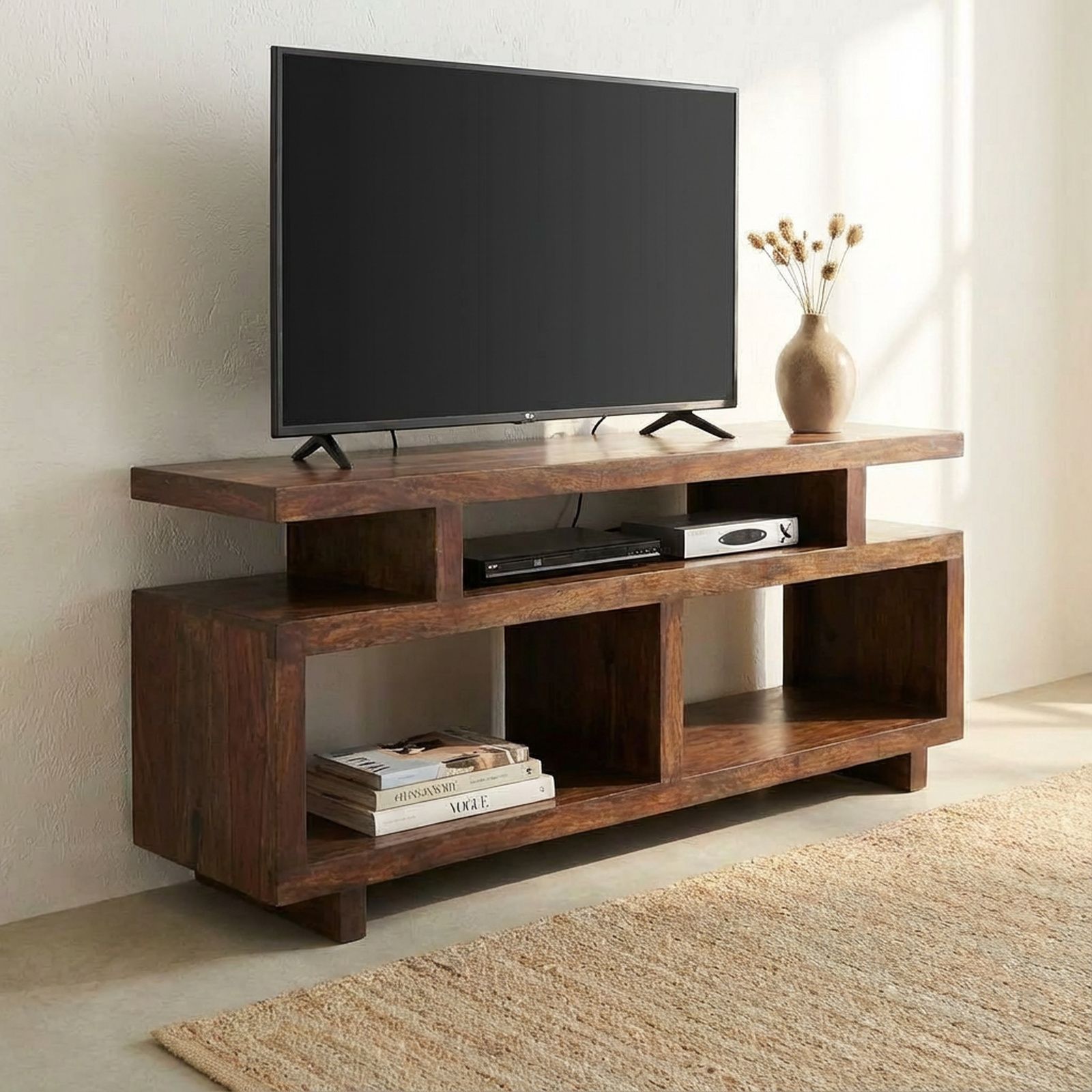 Ses lignes épurées forment cinq niches de taille variable, vous offrant un espace de rangement organisé pour vos DVDs et appareils multimédia. Son bois, du palissandre massif, est une essence exotique, caractérisée par un veinage allant du brun à l'orangé, pour un rendu chaleureux, accentué par le brillant donné par la cire d'abeille dont il est recouvert.