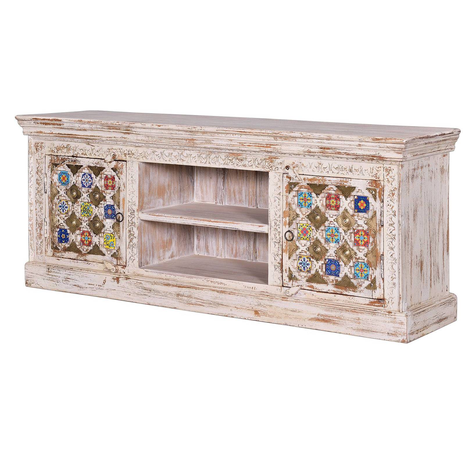 Ce meuble TV exotique s'inspire des meubles venus d'Inde et des décors des mille et une nuits. Il est en manguier massif orné de mosaïques et sera un meuble déco parfait pour votre salon.