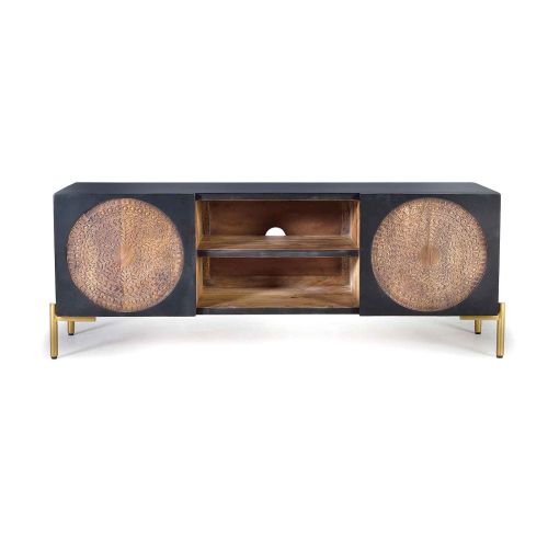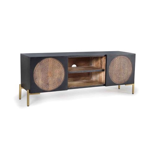 Le meuble TV indien est une pièce remarquable qui allie l'élégance intemporelle du bois de manguier massif à la modernité d'un piétement en métal doré.