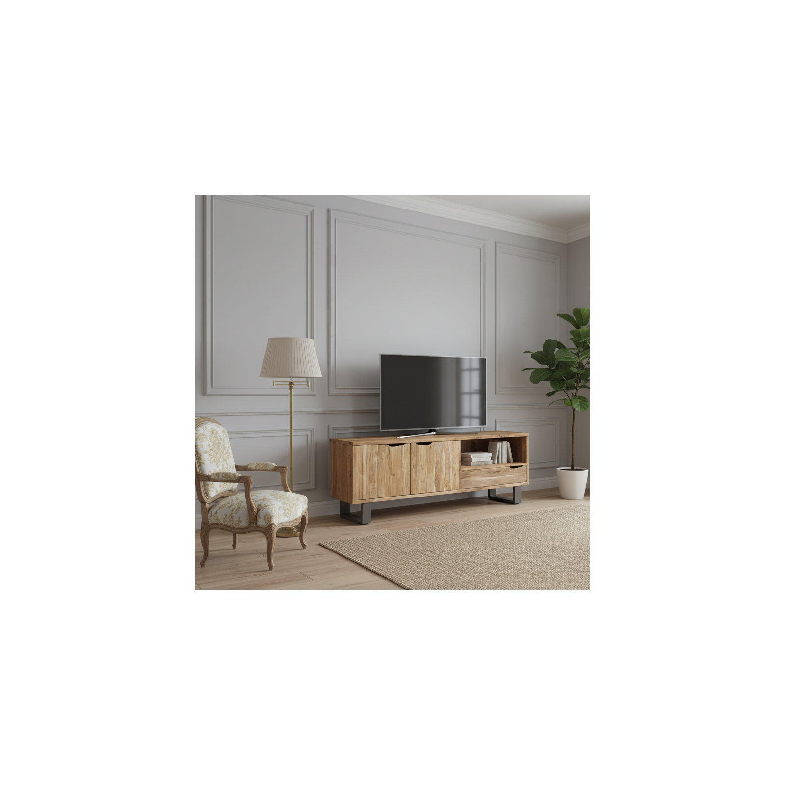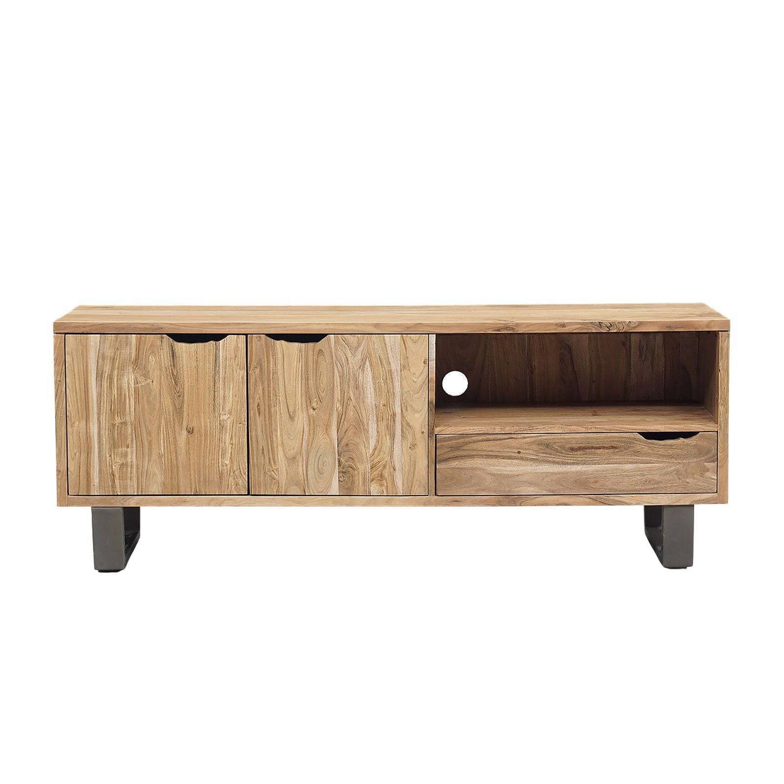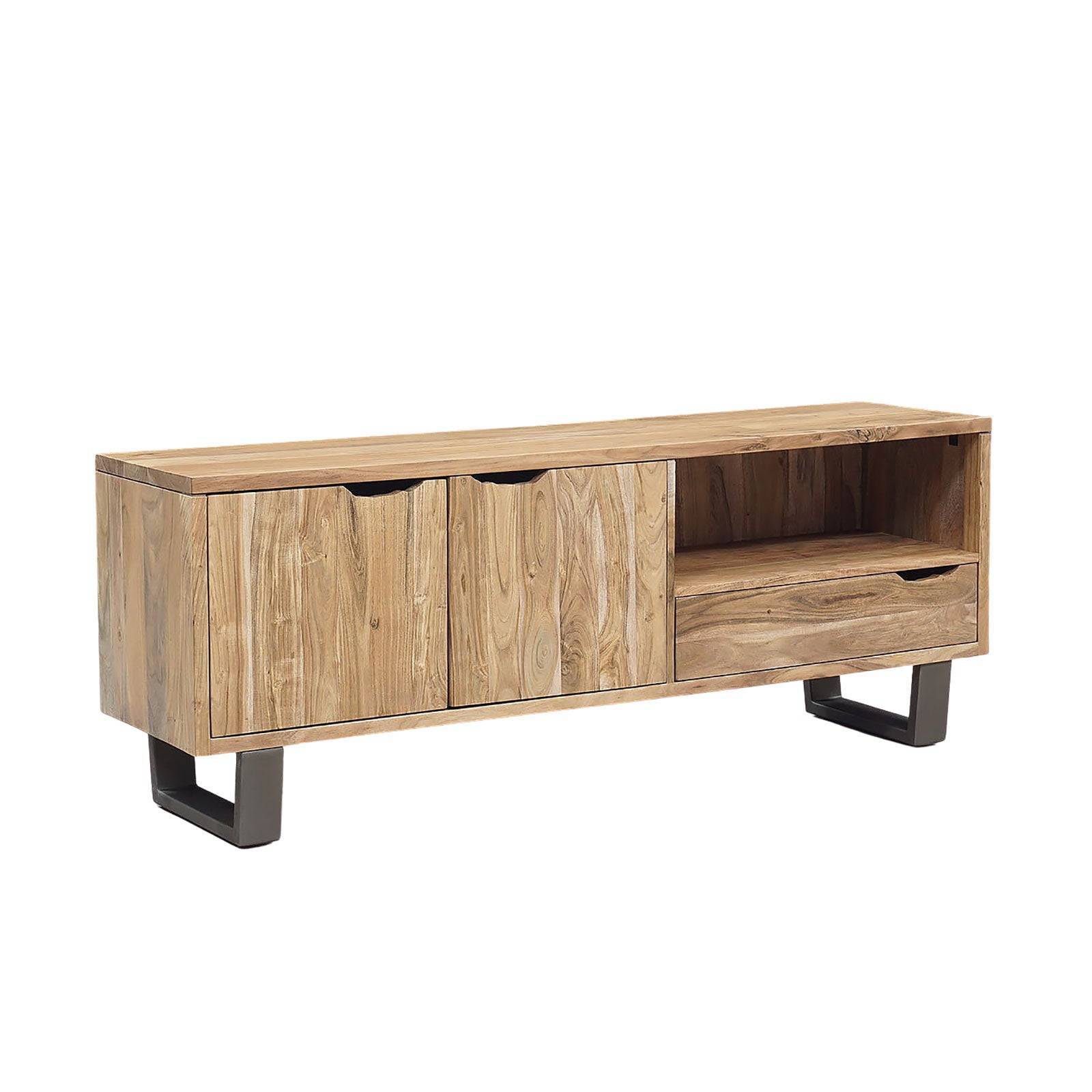 Idéal pour réchauffer l'atmosphère de votre salon, le meuble TV en acacia massif séduit par la qualité de son bois au veinage marbré et sa patine pleine de charme. Sa blondeur naturelle s'associe harmonieusement au piètement en métal noir, évoquateur du style industriel. Meuble haut de gamme, il est le fruit d'un travail artisanal réalisé en Inde. On apprécie l'authenticité du bois massif qui conserve son aspect brut et naturel jusque dans ses portes et tiroirs, ajourés au niveau de ses ouvertures.