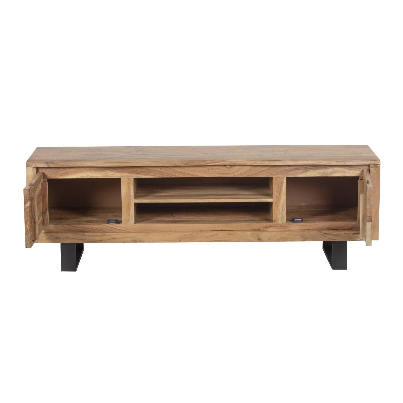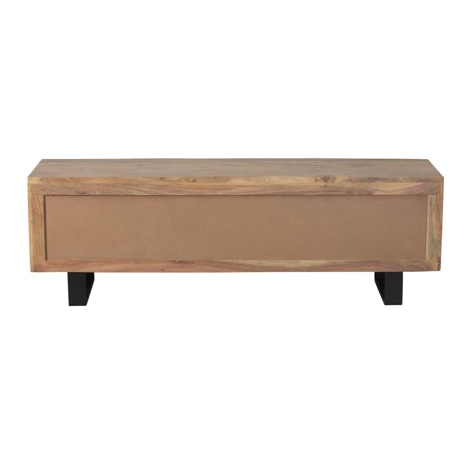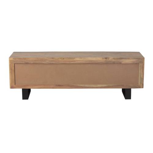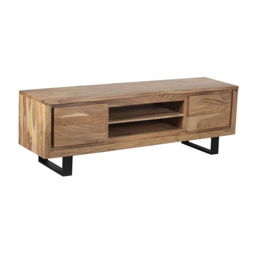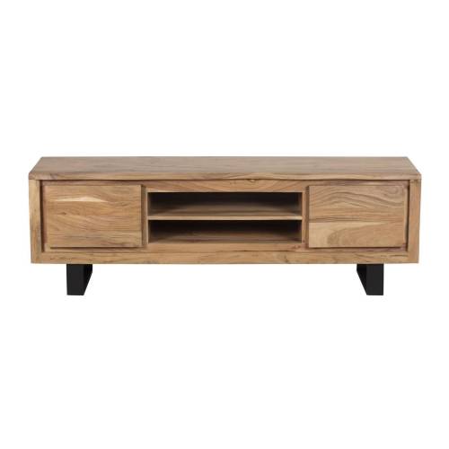 La caractéristique distinctive de ce meuble réside dans son piétement en acier industriel noir, qui ajoute une touche moderne et audacieuse à son design. La combinaison de l'acacia chaleureux et du métal noir crée un contraste visuel captivant, conférant au meuble une présence visuelle marquante dans votre salon. Doté d'une conception pratique, le meuble TV moderne Acacia Athos offre un espace généreux derrière ses 2 portes pour accueillir vos DVD ou vos consoles, ainsi que des niches discrètes pour ranger vos équipements multimédias.