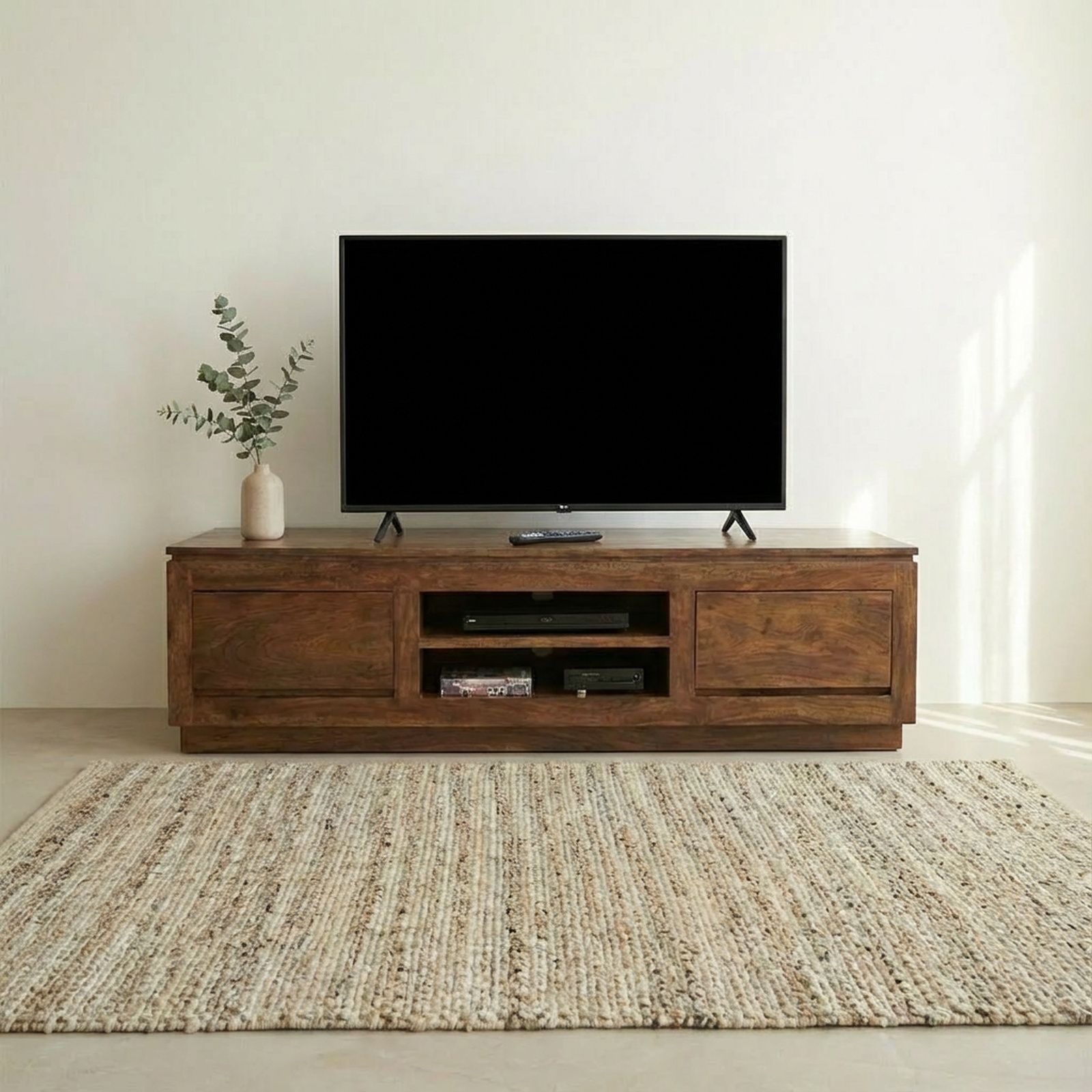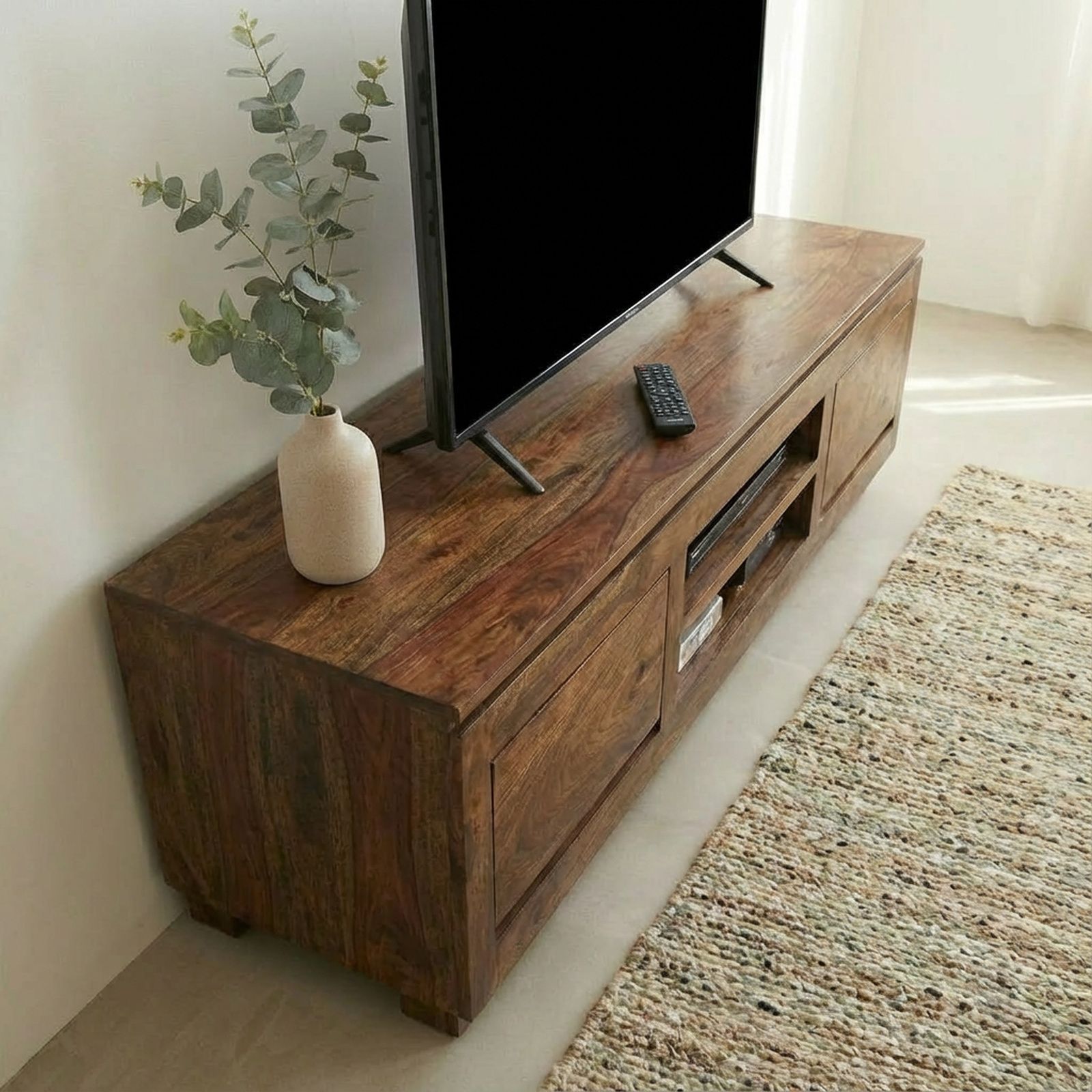 Lire les 2 avis Élégant et pratique, ce superbe meuble Tv en palissandre massif de la gamme Okina ne manque pas de charme. Il comporte deux niches et deux tiroirs.