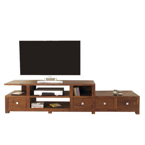 Grand meuble Tv palissandre massif, disposant d'espaces de rangement très pratiques pour vos DVDs, appareils multimédia et télécommandes grâce à ses quatre niches et ses quatre tiroirs. Son design déstructuré lui confère une allure atypique qui donnera beaucoup de charme à votre salon, qui se verra ainsi paré d'une atmosphère à la fois ethnique et moderne.