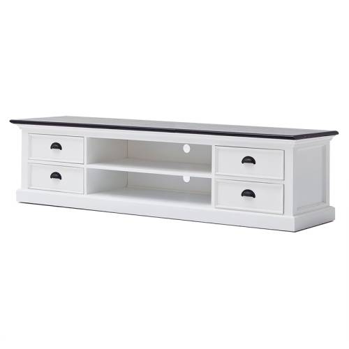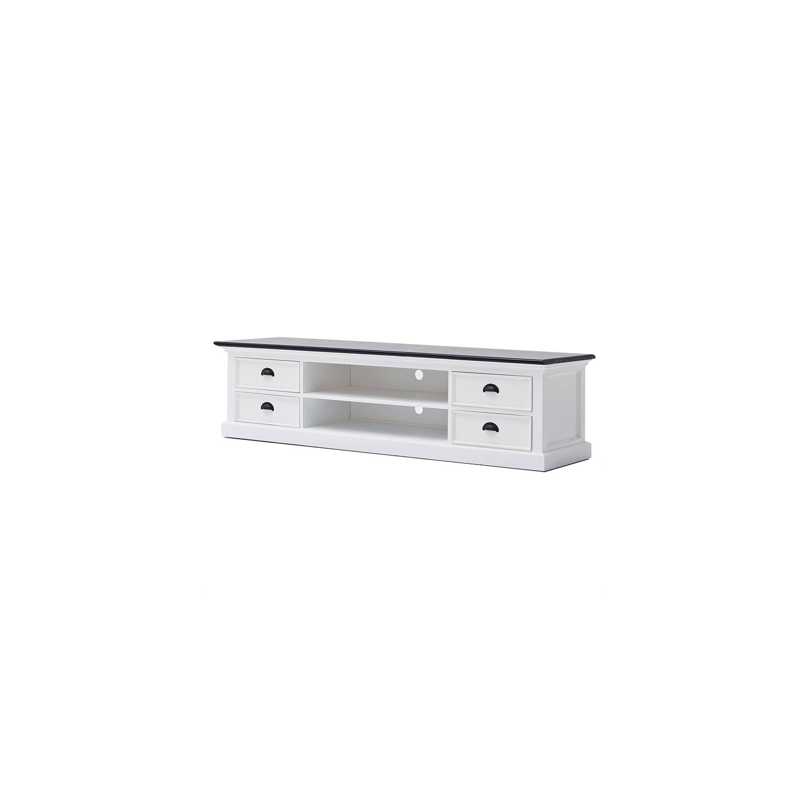 Une structure blanche et un plateau de couleur ébène, voici les atouts de ce beau meuble Tv en acajou. Sa peinture blanche est lumineuse tandis que son plateau sombre est brillant. Un contraste noir et blanc qui ira à merveille dans une pièce à la déco classique ! Le noir et blanc, en décoration comme dans d'autres domaines, fait toujours son petit effet. De plus, il est facile d'accorder à ces deux teintes d'autres coloris. Si vous aimez le style bord de mer, ce meuble Tv noir et blanc pourra tout à fait convenir !