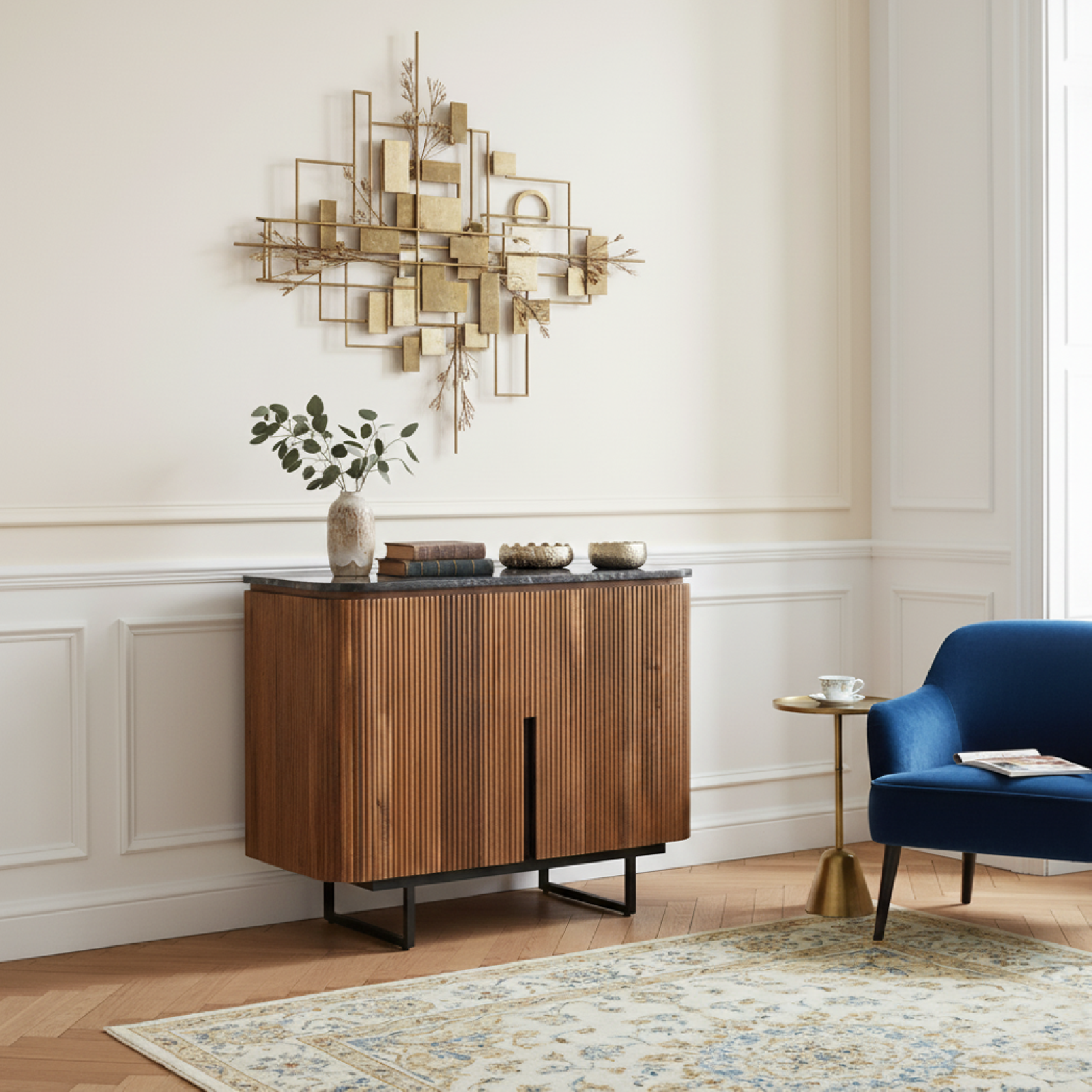 Explorez l'élégance moderne avec le petit buffet 2 portes bois en manguier massif, avec un sublime plateau en marbre noir et un piétement en métal noir.