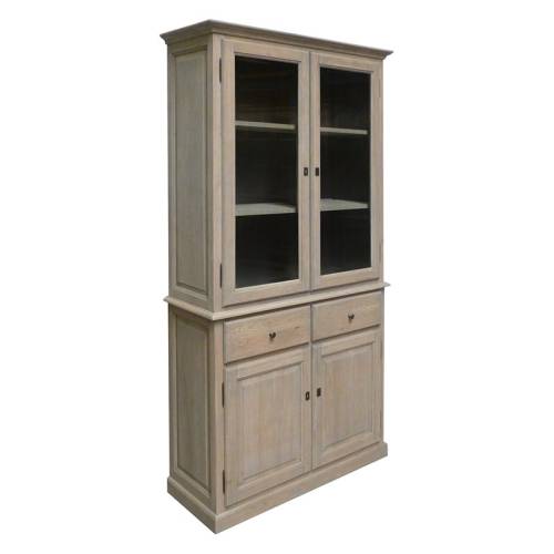 Ravissant petit buffet deux corps, qui représente un faible encombrement au sol mais qui possède une grande capacité d'accueil grâce à sa haute taille. Sa partie basse comprend deux portes refermant sur des étagères, qui seront les espaces de rangements adéquats pour des assiettes et plats, tandis que ses deux tiroirs pourront abriter vos couverts ainsi que votre linge de table. La partie vitrée, quant à elle, sera un parfait espace de rangements pour vos verres et vos objets de décoration, qui seront ainsi exposés tout en étant protégés de la poussière. Le bois qui compose ce meuble est du chêne massif, une très belle essence agréable au toucher, possédant un veinage discret et une couleur grège attrayante.
