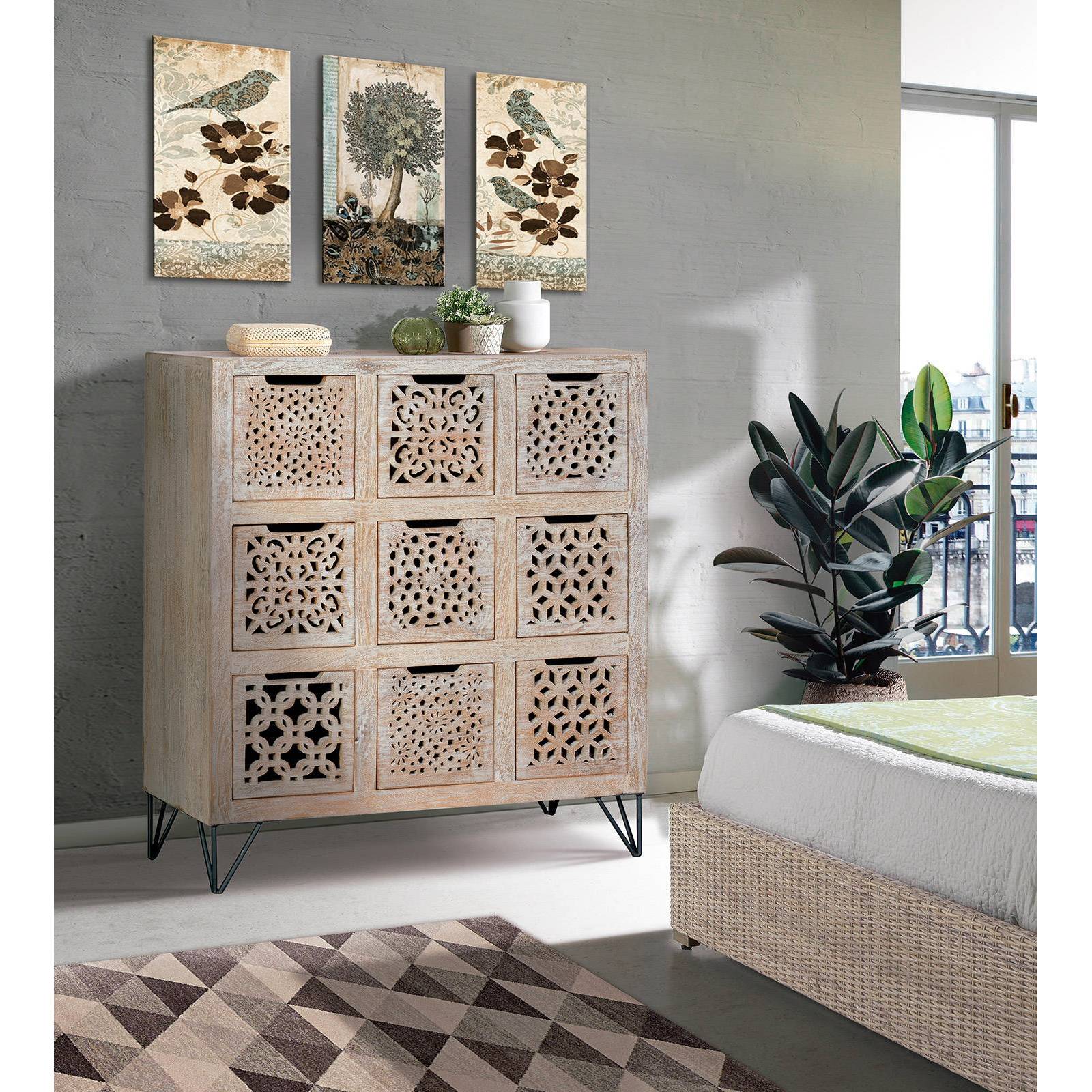 Le design exotique du chiffonnier est une véritable œuvre d'art qui évoque des voyages lointains et des contrées mystérieuses. Les 9 tiroirs sont magnifiquement sculptés, créant des motifs géométriques de cultures exotiques. Chaque tiroir est une pièce unique, reflétant un savoir-faire artisanal exceptionnel et ajoutant une touche d'originalité à l'ensemble du meuble. En plus de sa fonction de rangement pratique, ce petit chiffonnier devient également une pièce de décoration à part entière. Son design exotique et ses sculptures élégantes en font un meuble déco qui se démarque par son charme et son caractère distinctif. Il ajoutera ainsi une touche de personnalité à votre intérieur, faisant de ce meuble un véritable atout pour votre espace de vie.